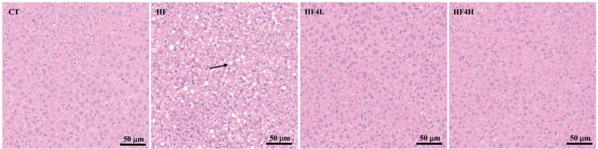 Fig. 1. Histological changes of liver sections were measured by H&E staining at 400 × magnification. CT, the control group; HF, the HFD-fed group; HF4L, the HF group fed with a daily FRT4 dose of 5 × 108 CFU/mL; HF4H, the group fed with a daily FRT4 dose of 5 × 109 CFU/mL.