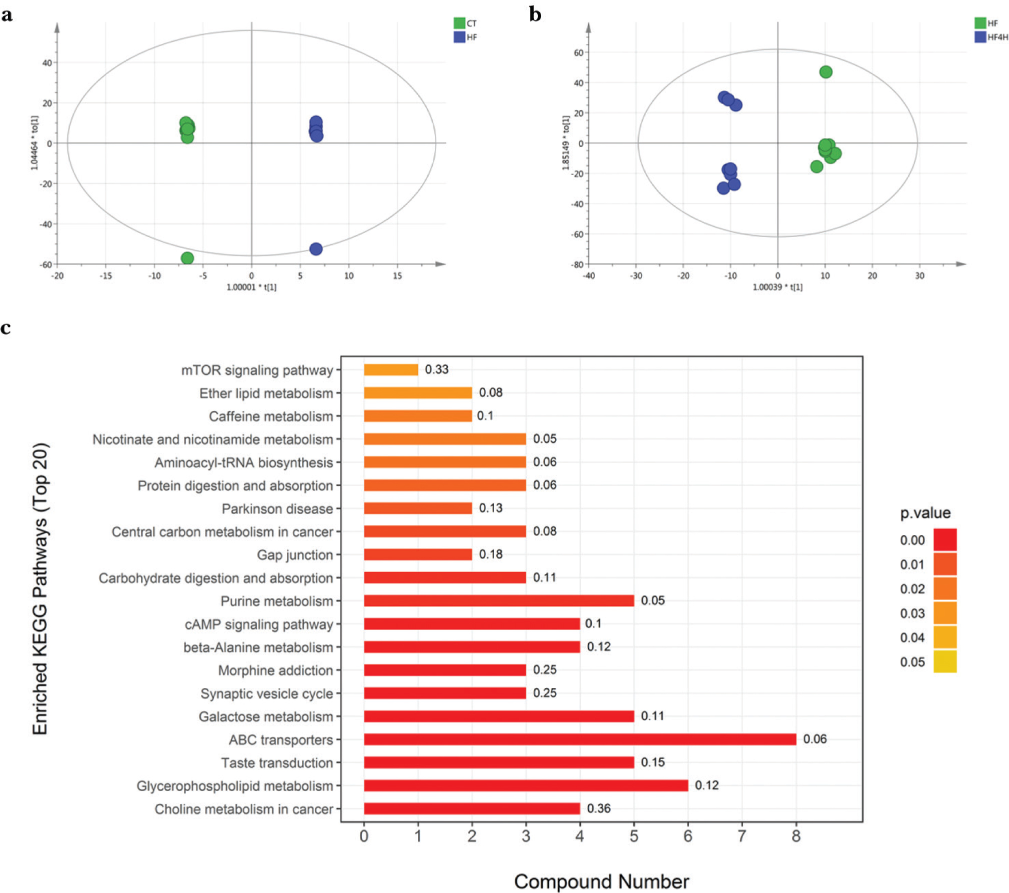 Fig. 2. Effect of L. plantarum FRT4 on liver metabolites was investigated by nontargeted metabolomics. OPLS-DA score plot analysis under the positive ion mode comparison between HF and CT (a), HF and HF4H (b). Enrichment analysis results of the KEGG pathway between HF4H and HF groups (c). Rich factor is defined as the ratio of the number of differential metabolites to total metabolites in each pathway.