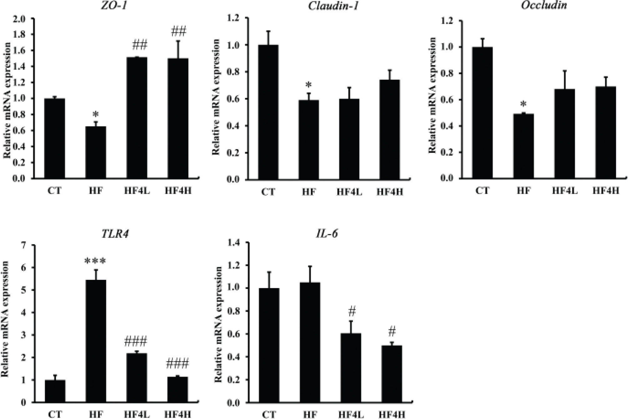 Considering that HFD may affect epithelial integrity, we studied the influence of FRT4 on the expression of three tight junction-related genes in the colon. Intestinal barrier dysfunction, such as the disruption of tight junction proteins zonula occludens-1 (ZO-1), occludin and claudin-1 that lead to impaired gut permeability and low-grade systemic inflammation (5), can lead to the development and progression of NAFLD. As shown in Fig. 3, in comparison with the HFD group, the mRNA expression levels of ZO-1, occludin, and claudin-1 were markedly increased but had no significant difference. Toll-like receptor 4 (TLR4) and IL-6 are an important endotoxin receptor and a proinflammatory factor, which were lowered after FRT4 administration. These results indicated that FRT4 intervention improved gut barrier integrity and attenuated inflammation.