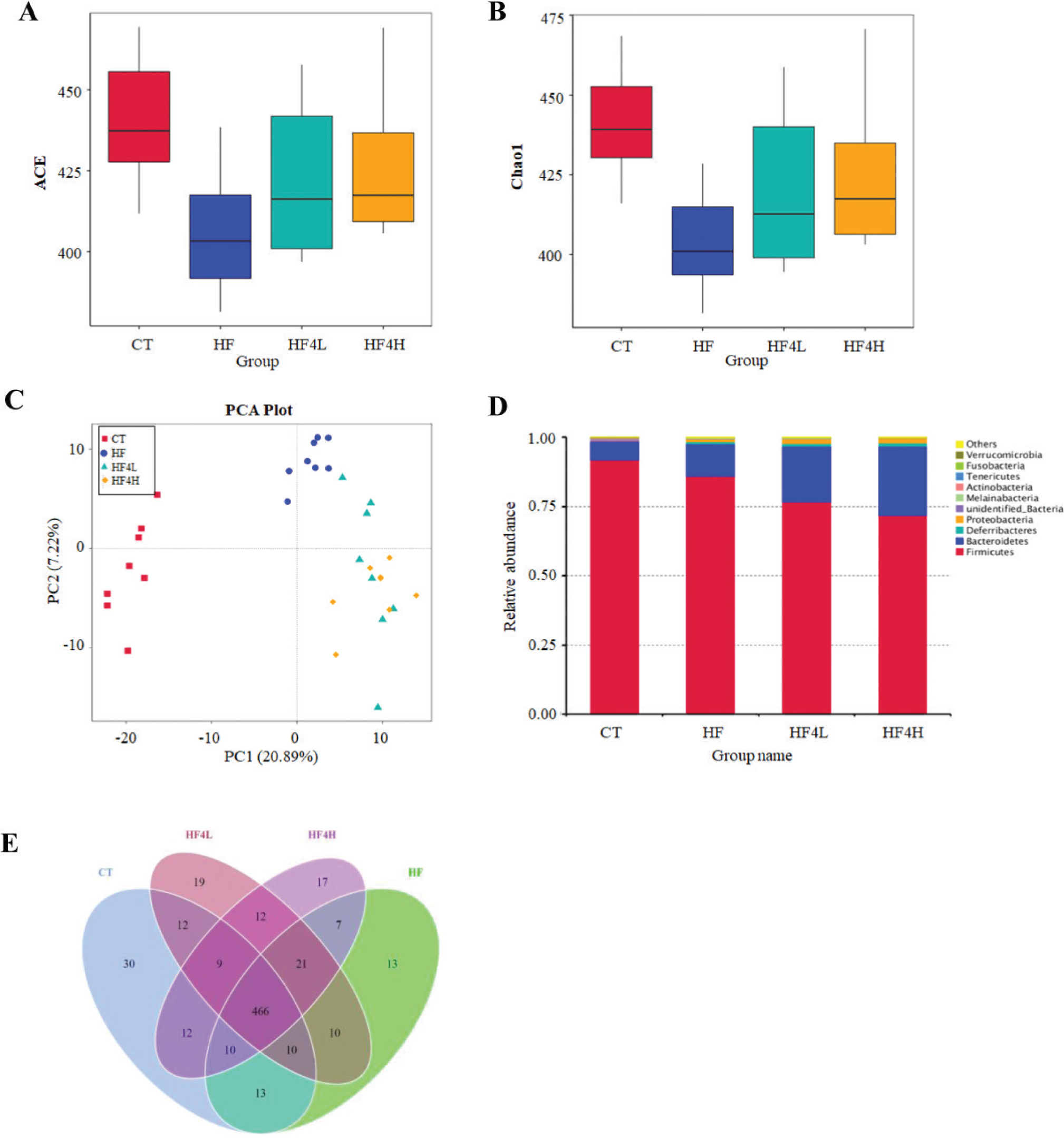 Fig. 4. Effects of L. plantarum FRT4 treatment on gut microbiota composition. (a) ACE. (b) Chao1. (c) PCA plot. (d) Microbial composition at the phylum level (top 10). (e) Venn diagram representation of the number of OTUs at the genus level from the CT, HF, HF4L, and HF4H groups. n = 8 in each group.