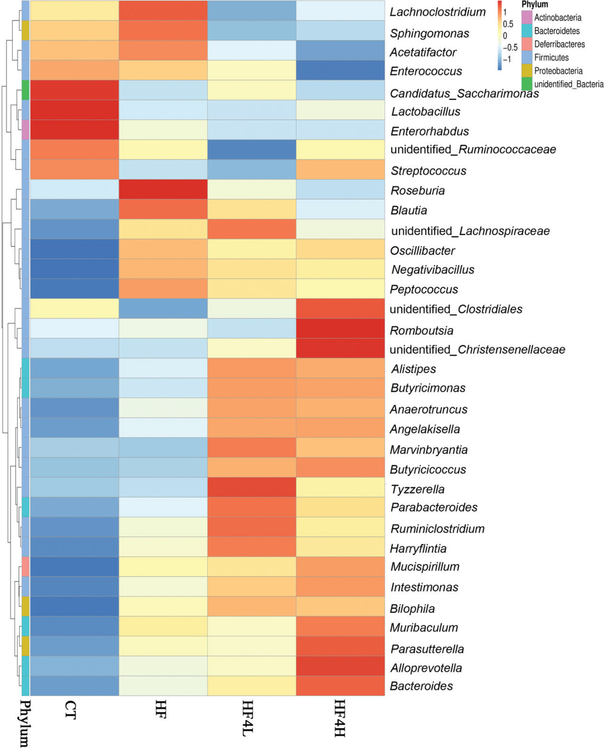 Fig. 5. Heatmap showing the hierarchical clustering of the bacterial genus profiles of the 35 most abundant OTUs in the CT, HF, HF4L, and HF4H groups. n = 8 in each group.