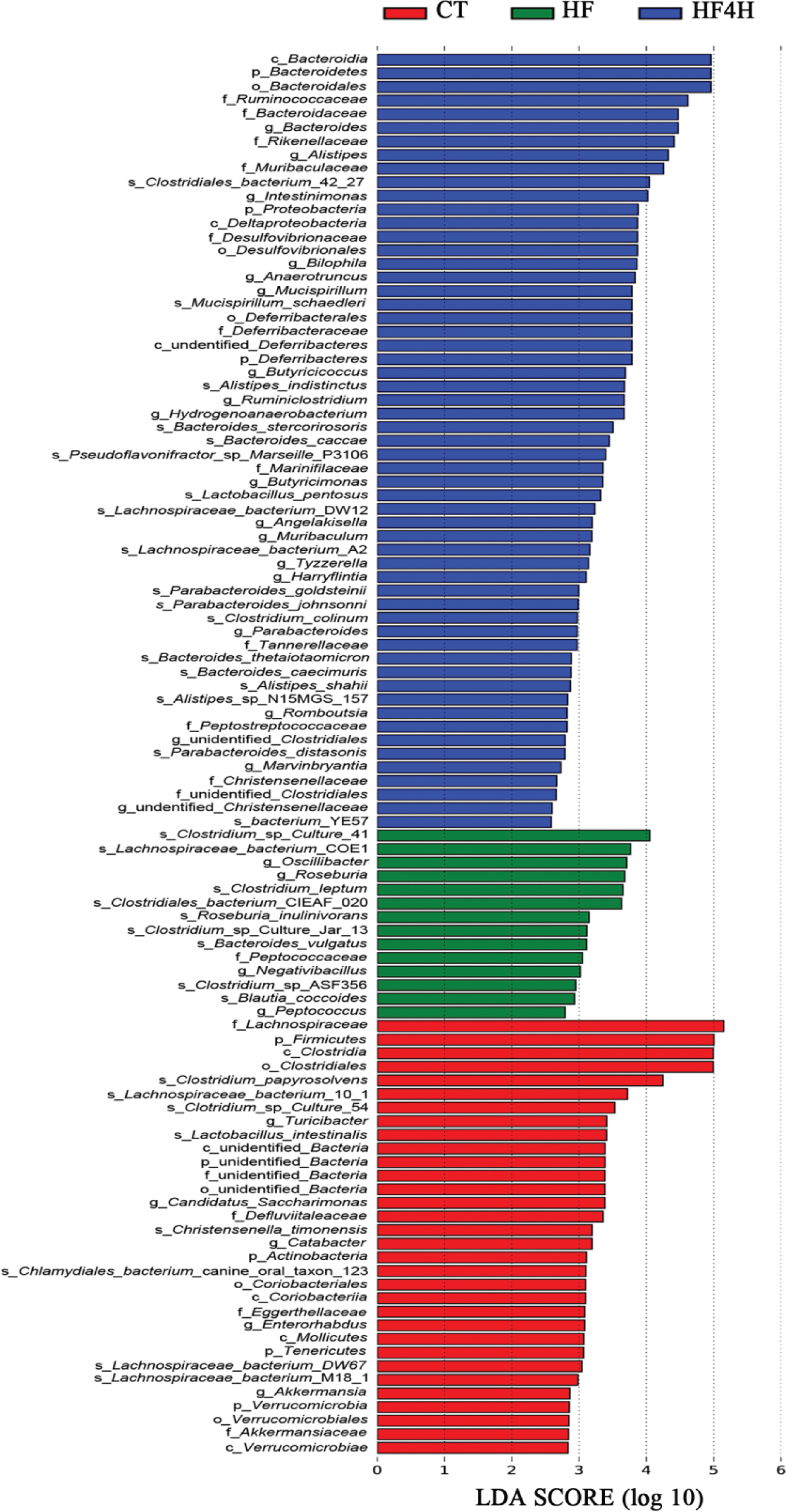 Fig. 6. LEfSe identified the gut microbiota phylotypes with a statistically significant difference in abundance among the CT, HF, and HF4H groups with LDA > 2. n = 8 in each group.