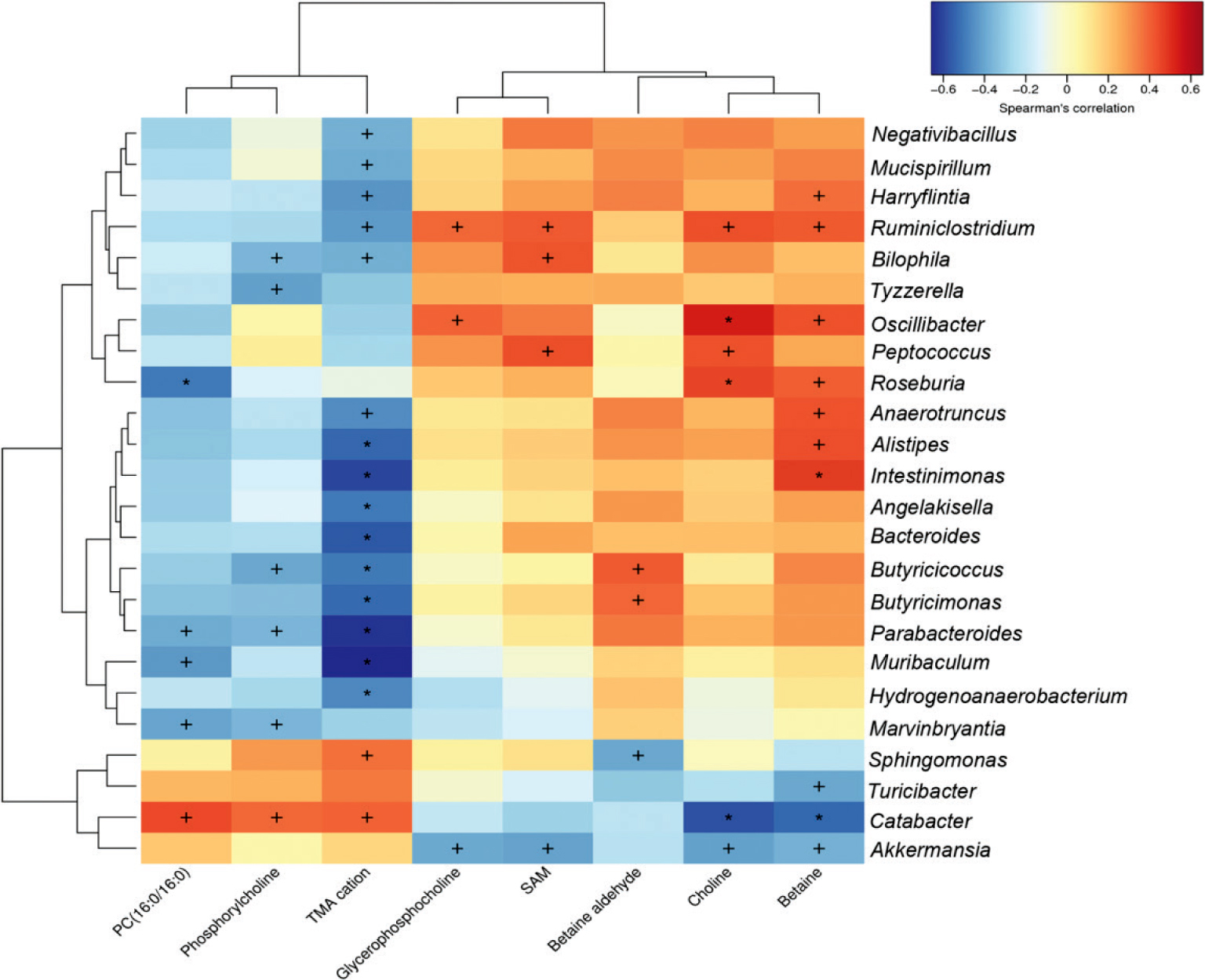 Fig. 7. Spearman correlation analysis between the concentration of liver metabolites and changes in relative abundance of individual genus. Significant differences at P < 0.05 and P < 0.01 are denoted with + and *, respectively.