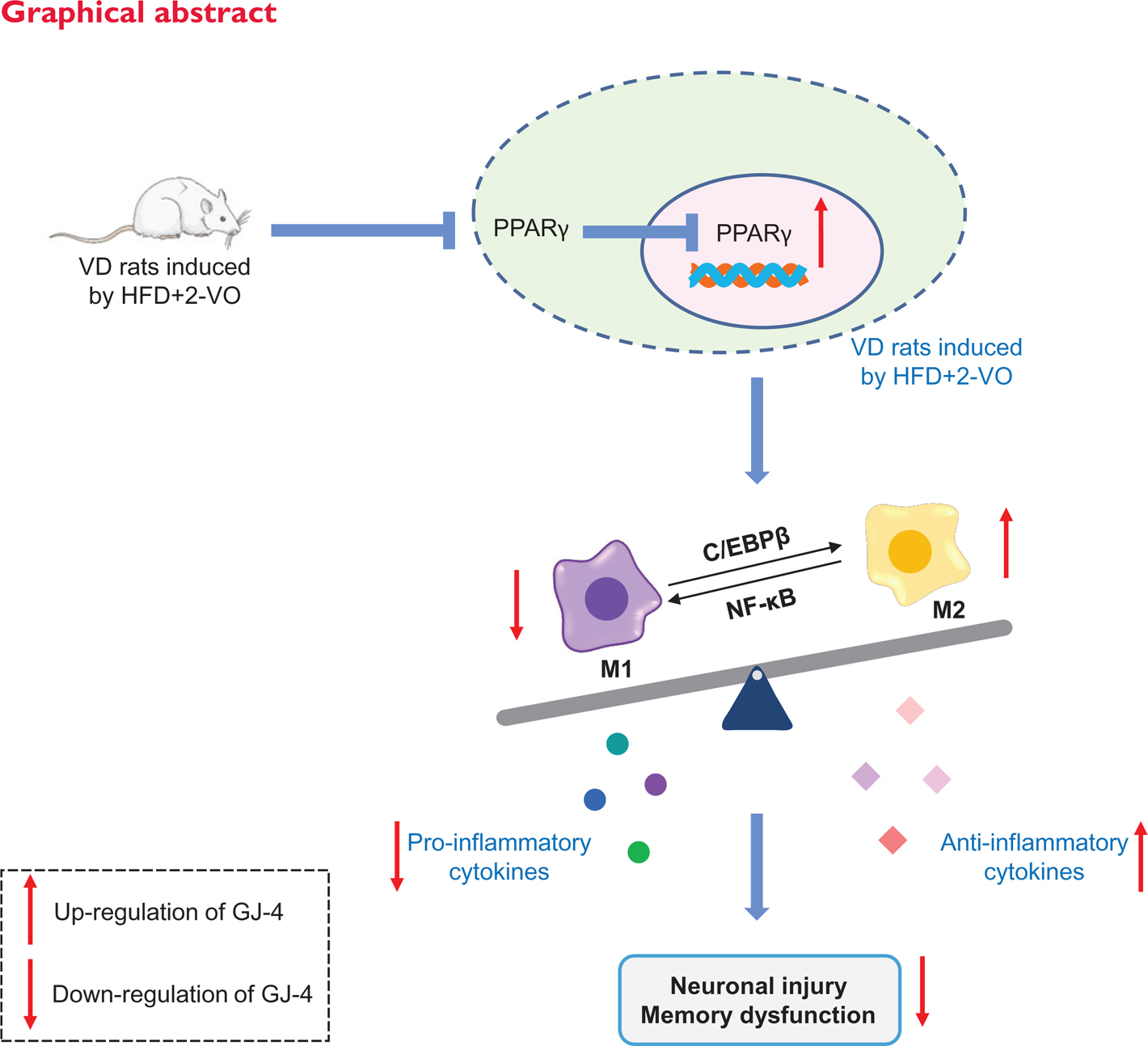 Results: Our results showed that GJ-4 could significantly reduce serum lipids level and improve cerebral blood flow in hyperlipidemic VD rats. Additionally, treatment with GJ-4 remarkedly ameliorated memory impairment and alleviated neuronal injury. Mechanistic investigation revealed that the neuroprotective effects of GJ-4 might be attributed to the inhibition of microglia-mediated neuro-inflammation via regulating the M1/M2 polarization. Our data further illustrated that GJ-4 could regulate the phenotype of microglia through activating the peroxisome proliferator-activated receptor-γ (PPAR-γ) and subsequently inhibited nuclear factor-κB (NF-κB) nuclear translocation and increased CCAAT/enhancer-binding protein β (C/EBPβ) expression.