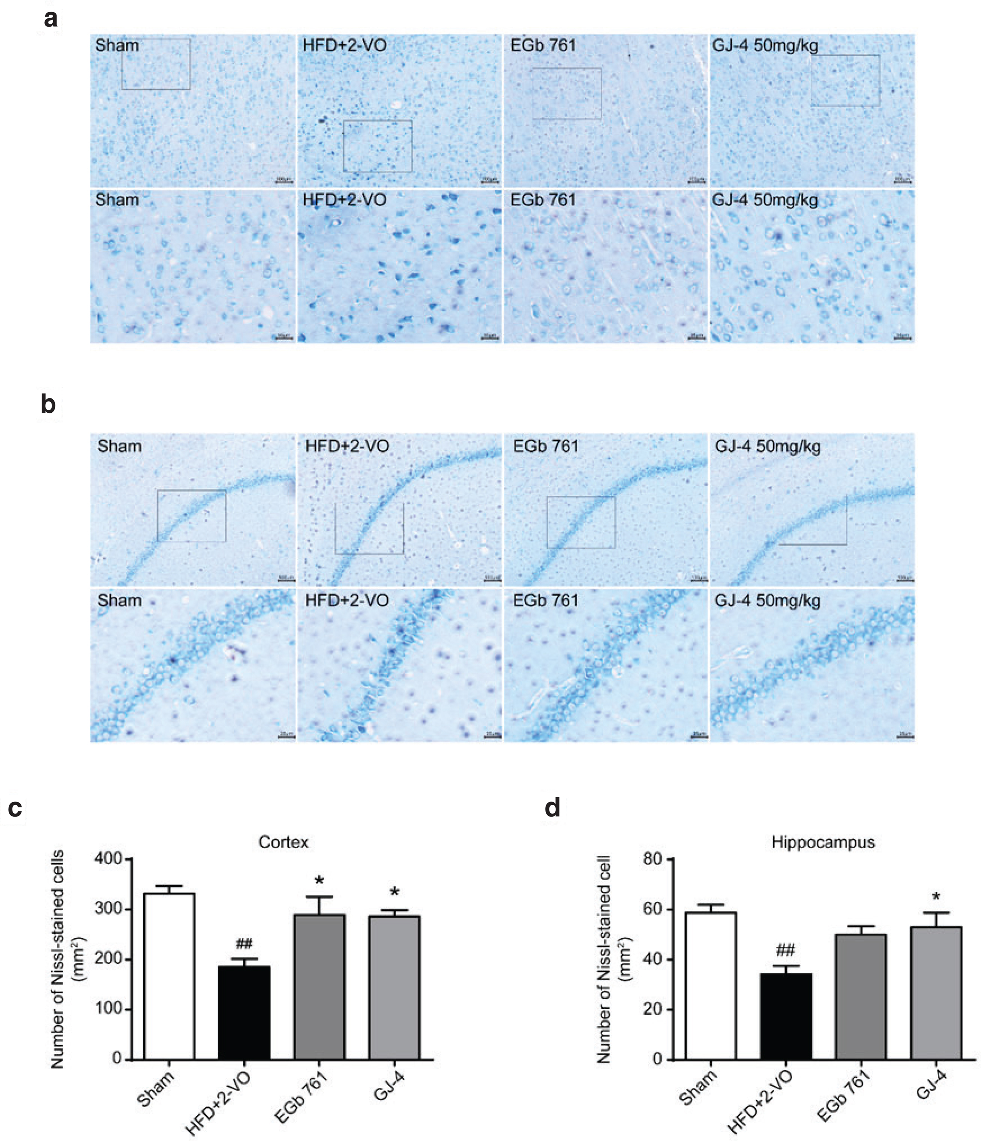 Fig. 4. GJ-4 alleviated neuronal injury of HFD+2-VO-induced VD rats. Rats were fed with HFD for 7 weeks followed by 2-VO surgery, and then they were treated with GJ-4 for 3 weeks. (a) Nissl staining in the cortex. (b) Nissl staining in the CA1 region of hippocampus. (c) Statistical analysis of Nissl-stained cells in the cortex. (d) Statistical analysis of Nissl-stained cells in the CA1 region of hippocampus. The dosage of EGb761 and GJ-4 was both 50 mg/kg. Results were expressed as mean ± SEM from 3 to 5 rats. ##P < 0.01 versus sham-operated rats; *P < 0.05 versus HFD+2-VO rats.