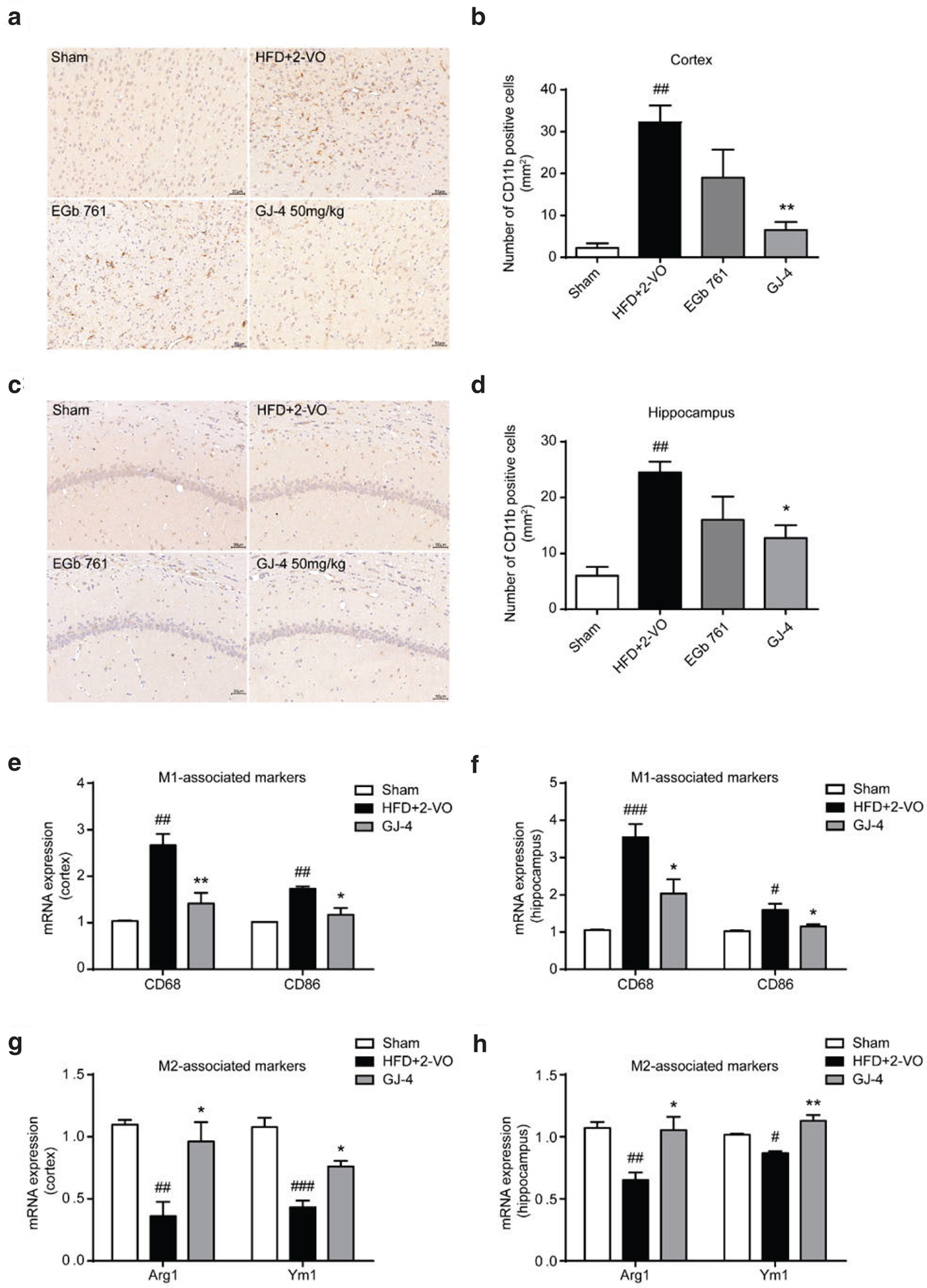 Fig. 5. GJ-4 suppressed microglial activation and modulated microglial M1/M2 polarization in HFD+2-VO-induced VD rats. Rats were fed with HFD for 7 weeks followed by 2-VO surgery, and then they were treated with GJ-4 for 3 weeks. (a) CD11b staining in the cortex. (b) Statistical analysis of CD11b positive cells in the cortex. (c) CD11b staining in the hippocampus. (d) Statistical analysis of CD11b positive cells in the hippocampus. (e) CD68 and CD86 mRNA expressions in the cortex. (f) CD68 and CD86 mRNA expressions in the hippocampus. (g) Arg1 and Ym1 mRNA expressions in the cortex. (h) Arg1 and Ym1 mRNA expressions in the hippocampus. The dosage of EGb761 and GJ-4 was both 50 mg/kg. Results were shown as mean ± SEM from 3 to 5 rats. #P < 0.05, ##P < 0.01, ###P < 0.001 versus sham-operated rats; *P < 0.05, **P < 0.01 versus HFD+2-VO rats.