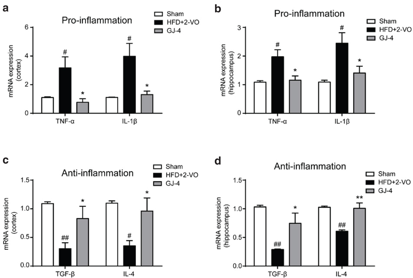 Fig. 6. GJ-4 inhibited pro-inflammatory cytokine release and promoted anti-inflammatory cytokine production in HFD+2-VO-induced VD rats. Rats were fed with HFD for 7 weeks followed by 2-VO surgery, and then they were treated with GJ-4 for 3 weeks. (a) TNF-α and IL-1β mRNA expressions in the cortex. (b) TNF-α and IL-1β mRNA expressions in the hippocampus. (c) TGF-β and IL-4 mRNA expressions in the cortex. (d) TGF-β and IL-4 mRNA expressions in the hippocampus. The dosage of GJ-4 was 50 mg/kg. Results were shown as mean ± SEM from 4 to 5 rats. #P < 0.05, ##P < 0.01 versus sham-operated rats; *P < 0.05, **P < 0.01 versus HFD+2-VO rats.