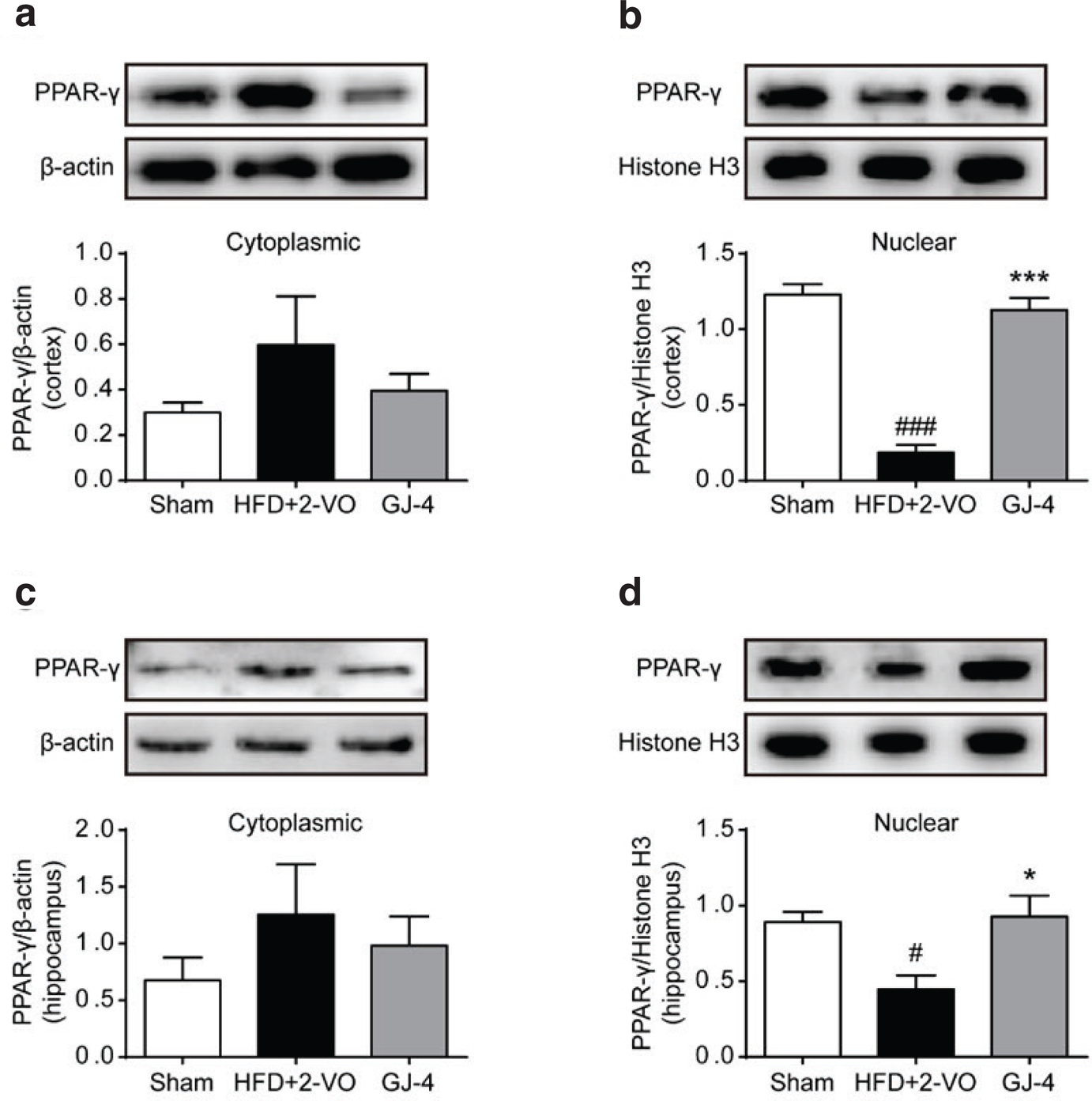 Fig. 7. GJ-4 stimulated PPAR-γ nuclear translocation. Rats were fed with HFD for 7 weeks followed by 2-VO surgery, and then they were treated with GJ-4 for 3 weeks. (a) PPAR-γ expression in the cytoplasm of cortex. (b) PPAR-γ expression in the nucleus of cortex. (c) PPAR-γ expression in the cytoplasm of hippocampus. (d) PPAR-γ expression in the nucleus of hippocampus. The dosage of GJ-4 was 50 mg/kg. Results were shown as mean ± SEM from 4 to 5 rats. #P < 0.05, ###P < 0.001 versus sham-operated rats; *P < 0.05, ***P < 0.001 versus HFD+2-VO rats.