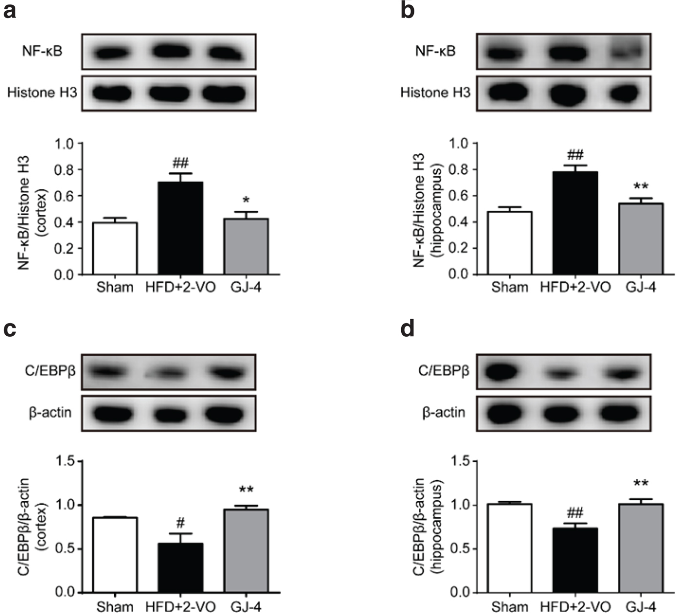 Fig. 8. GJ-4 suppressed NF-κB nuclear translocation and elevated C/EBPβ expression in HFD+2-VO-induced VD rats. Rats were fed with HFD for 7 weeks followed by 2-VO surgery, and then they were treated with GJ-4 for 3 weeks. (a) NF-κB expression in the nucleus of cortex. (b) NF-κB expression in the nucleus of hippocampus. (c) C/EBPβ expression in the cortex. (d) C/EBPβ expression in the hippocampus. The dosage of GJ-4 was 50 mg/kg. Results were shown as mean ± SEM from 4 to 5 rats. #P < 0.05, ##P < 0.01, ###P < 0.001 versus sham-operated rats; *P < 0.05, **P < 0.01 versus HFD+2-VO rats.