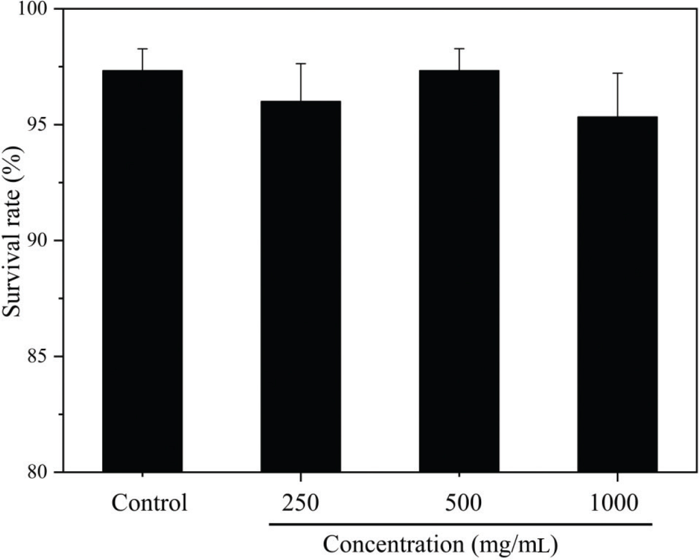 The lifespan is one of the valuable indicators in evaluating the physiological characteristics of nematodes. It displays the growth status of nematodes and potential toxicity of the target substance. Herein, the polysaccharide of LDP-1 with concentrations of 125, 250, 500, and 1,000 μg/mL (w/v) were set as the parallel groups for treating the nematodes. The toxicity of the prepared LDP-1 solutions was investigated. As shown in Fig. 2, LDP-1 within concentrations of 125–1,000 μg/mL had no significant influence on the SRs of the treated nematodes (P > 0.05), indicating the polysaccharide of LDP-1 was nontoxic and safe to the wild-type nematodes. In subsequent experiments, three level concentrations of 250, 500, and 1,000 μg/mL were selected to further explore the effects of polysaccharide LDP-1 on the lifespan of wild nematodes.