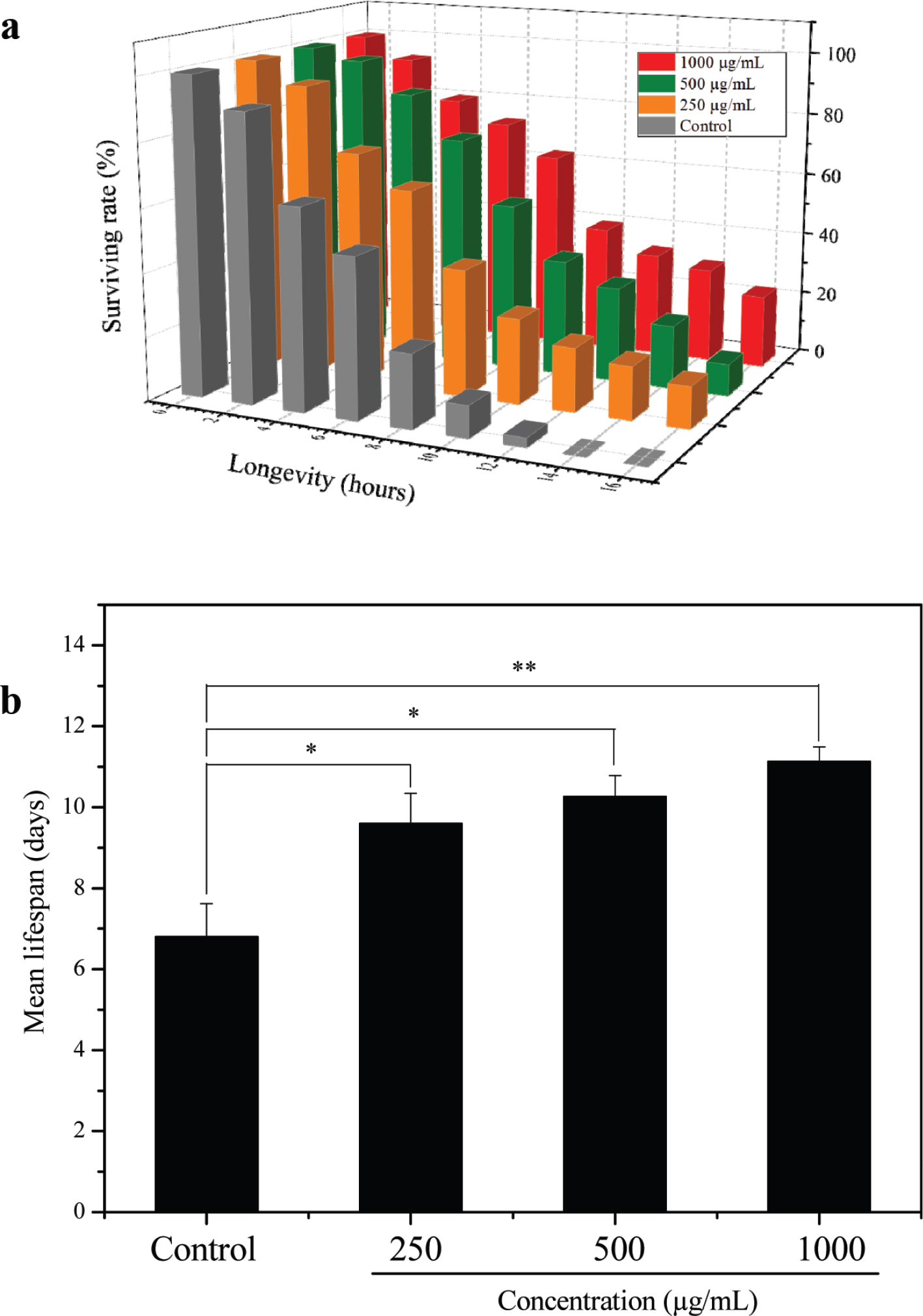 Fig. 5. Determination of C. elegans’ lifespan under an oxidative stress environment using Jugularia as the oxidant. (a) Survival rate of C. elegans and (b) average life expectancy of C. elegans under oxidative stress conditions. Significant differences were compared from the Control at *P < 0.05 and **P < 0.01.