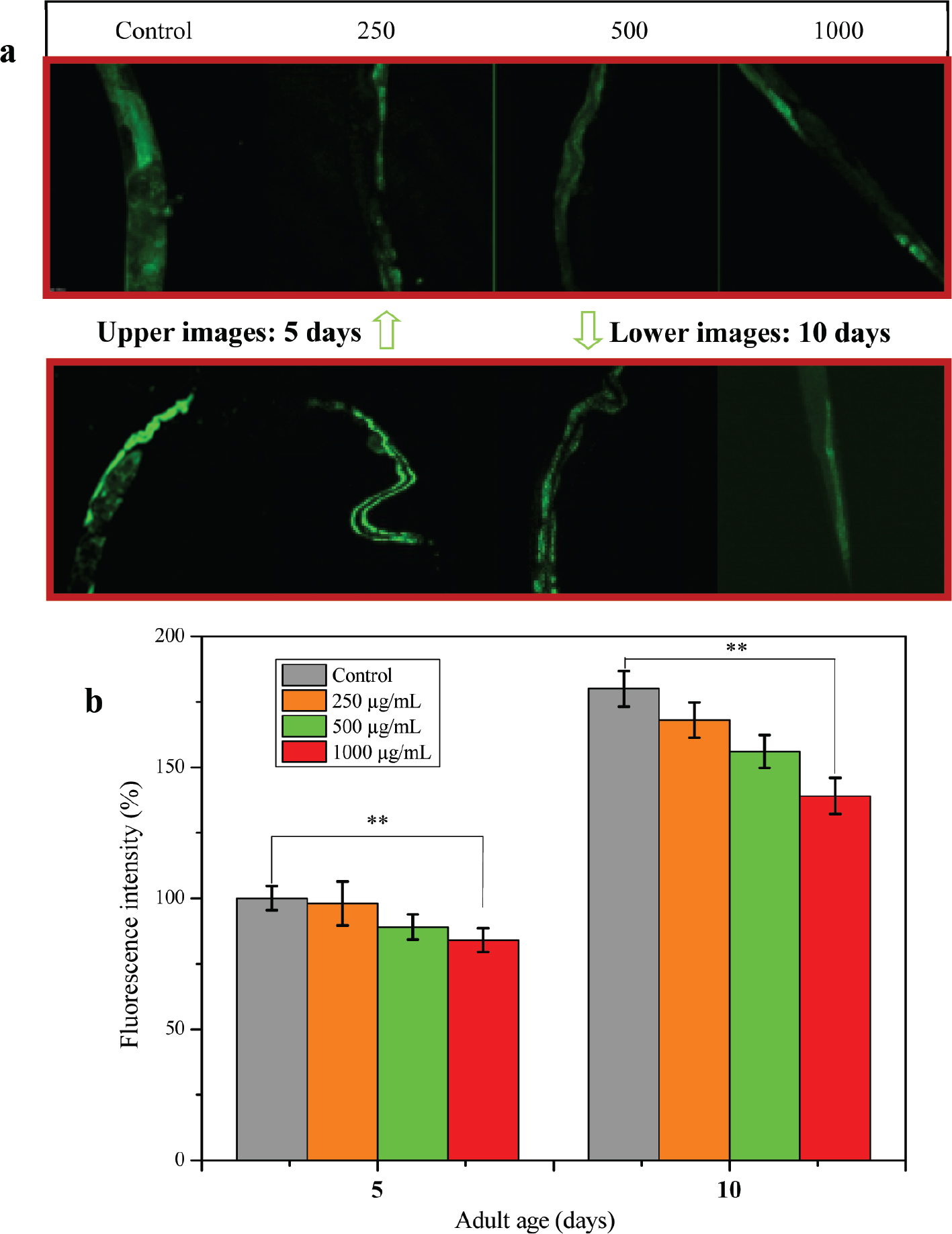 Fig. 7. Determination of ROS levels in C. elegans under normal environment and oxidative stress conditions. Comparisons were obtained from the first point of the Control at **P < 0.01.