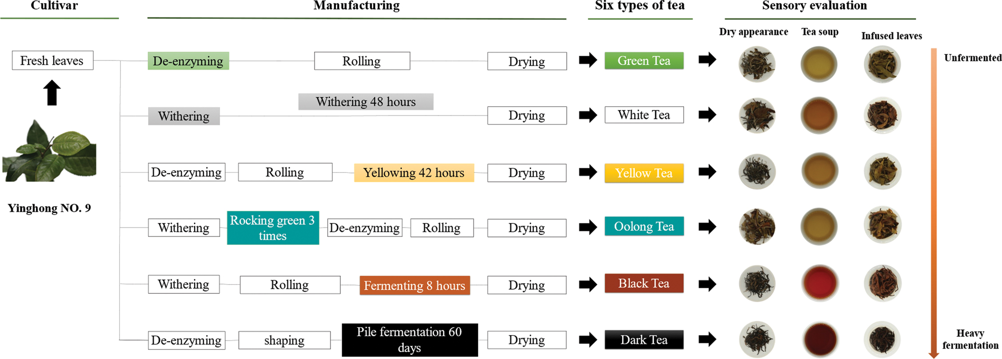 All tea samples were processed in Tea Research Institute of Guangdong Academy of Agricultural Sciences using fresh leaves of a uniform specification of one bud with two to six leaves in 2020. Briefly, fresh tea leaves were heated at 230°C to inactivate the endogenous enzymes, rolled for 30 min and then directly dried into green tea. White tea was prepared by withering the fresh tea leaves at room temperature for 48 h and then dried. Another part of the fresh leaves was fixed at 180°C to inactivate most of the enzymes, rolled for 30 min, yellowed at room temperature and 70% relative humidity for 42 h, and finally dried into yellow tea. Oolong tea is the most aromatic type of tea. Tea leaves were rocking green three times after withering, then fixed at 230°C, rolled for 30 min, and finally dried into oolong tea. Black tea was prepared by withering the fresh tea leaves for 6–8 h, rolled for 30 min, fermentation with endogenous enzymes at room temperature and 90% relative humidity for 8 h, and drying. It is a type of fully fermented tea. To prepare dark tea, the tea leaves were withered and heated at 230°C to inactivate the enzymes, rolled for 30 min, and then pile-fermented for 60 days. The pile was turned over, the temperature was adjusted as required during the fermentation period, and the fermented leaves were dried (Fig. 1). According to the processing methods of black tea, we set the fermentation time to four gradients of 0, 2, 5, and 8 h to make black tea with different degrees of fermentation. Similarly, we set the stack fermentation time to a gradient of 0, 10, 20, 30, 40, 50, and 60 days to make dark tea with different stacking times.