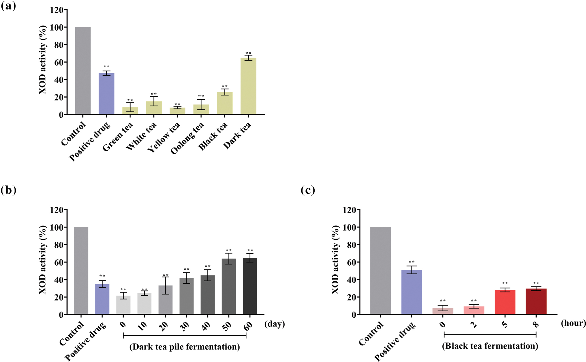 Fig. 2. XOD activity of tea. (a) XOD activity in the presence of different teas; (b) XOD activity in the presence of dark tea fermented for 0, 10, 20, 30, 40, 50, and 60 days. (c) XOD activity in the presence of black tea fermented for 0, 2, 5, and 8 h. The data are expressed as mean ± SD. nsP > 0.1, *P < 0.1, **P < 0.01, ***P < 0.001, and ****P < 0.0001 are compared with the control.