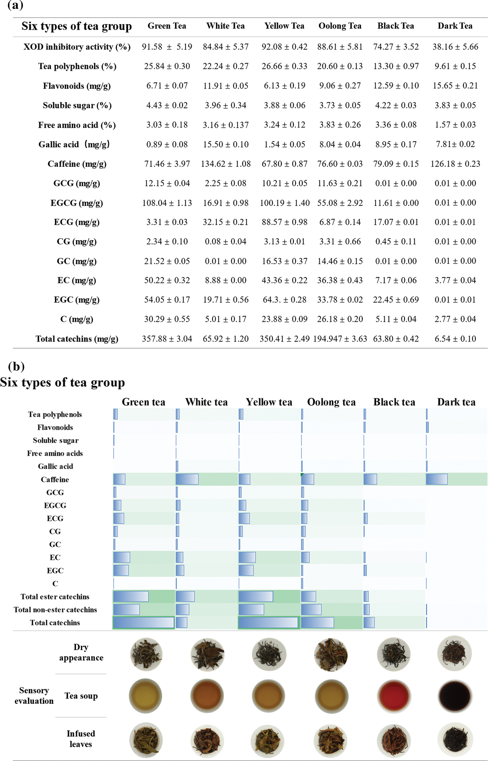 Fig. 3. Biochemical components and sensory evaluation of six major teas. (a) The content of biochemical components in six types of tea. (b) 1) Heat map showing changes in biochemical components and sensory evaluation. The length of the rectangle and the color intensity indicate the content. 2) The results of sensory evaluation in six types of tea. As the degree of fermentation deepens, the color of the dry tea, the brewed tea soup, and the brewed tea leaves were gradually deepen.