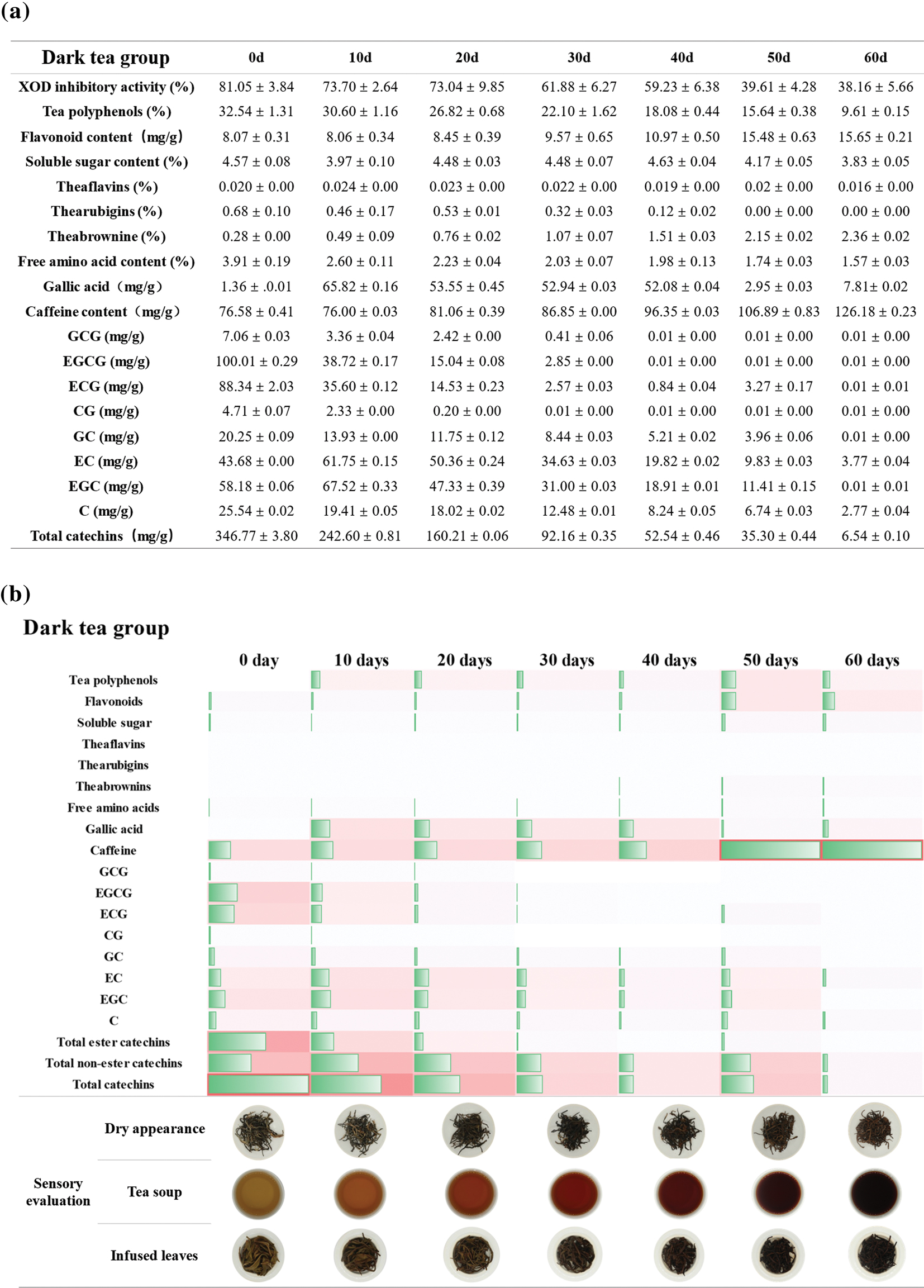 Fig. 4. Biochemical components and sensory evaluation of dark tea with different degrees of pile fermentation. (a) The content of biochemical components in dark tea fermented for 0, 10, 20, 30, 40, 50, and 60 days. (b) 1) Heat map showing changes in biochemical components and sensory evaluation. The length of the rectangle and color intensities indicate the content. 2) The results of sensory evaluation in dark tea with different fermentation times. As the degree of fermentation deepens, the color of the dry tea, the brewed tea soup, and the brewed tea leaves were gradually deepen.