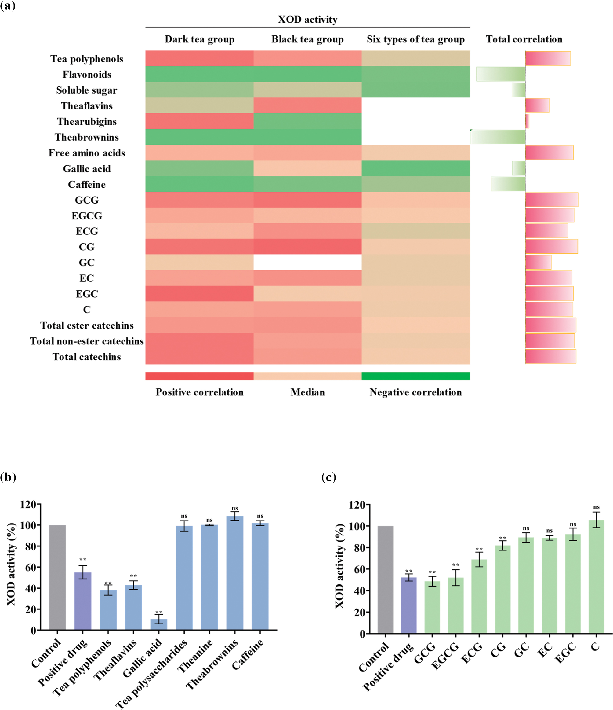 Fig. 6. XOD activity of biochemical components and correlation analysis with chemical properties of tea. (a) Correlation between the content of bioactive compounds and XOD activity. The length of the rectangle indicates degree of correlation; red – positive correlation, buff – medium, and green – negative correlation. Positive control drug: allopurinol. (b) XOD activity in the presence of tea polyphenols, theaflavins, gallic acid, tea polysaccharides, theanine, theabrownins, and caffeine; (c) XOD activity in the presence of catechin monomers.