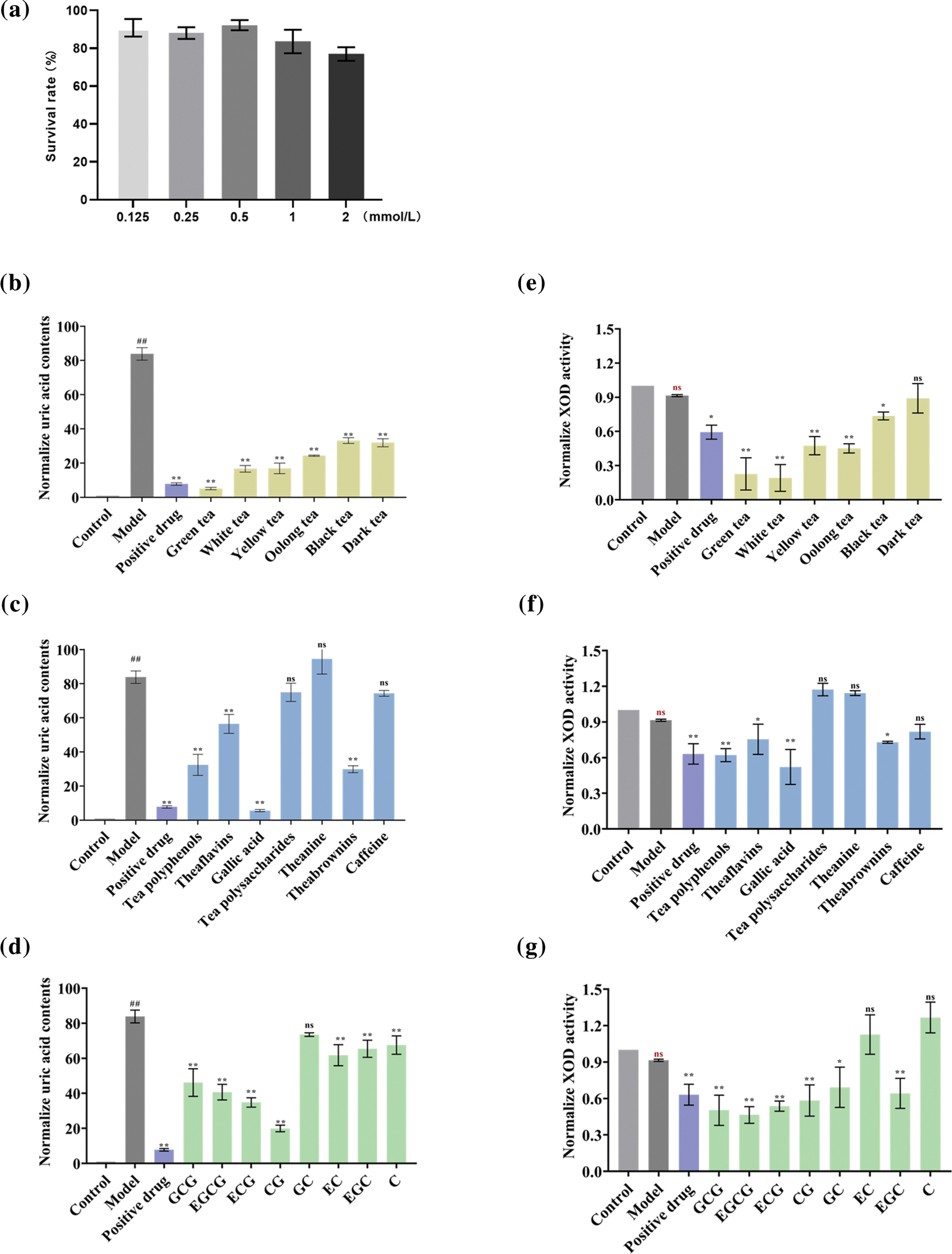 We established a high uric acid producing cell model by using human liver cells and compared all kinds of tea and its bioactive components on stabilizing uric acid synthesis by analyzing uric acid levels, mRNA level of XDH, and XOD activity. It was the first research to simultaneously analyze and compare the effects of polyphenols, theaflavins gallic acid, theabrownins, L-theanine, caffeine, and tea polysaccharides on uric acid metabolism. The uric acid-lowering effect of tea was very likely to be related to the degree of fermentation and the content of tea polyphenols and theaflavins. Interestingly, we found that gallic acid had the most significant effect among all the samples (Fig. 8d). This may provide a major scientific research basis for further research on the uric acid-lowering components of tea. Our study had a great guiding significance for the deep processing of tea and provided a strong scientific basis for the purchase of tea for patients with high uric acid. In addition, it also provided an important theoretical basis for the follow-up study of the regulation (synthesis and excretion) of uric acid metabolism by tea.