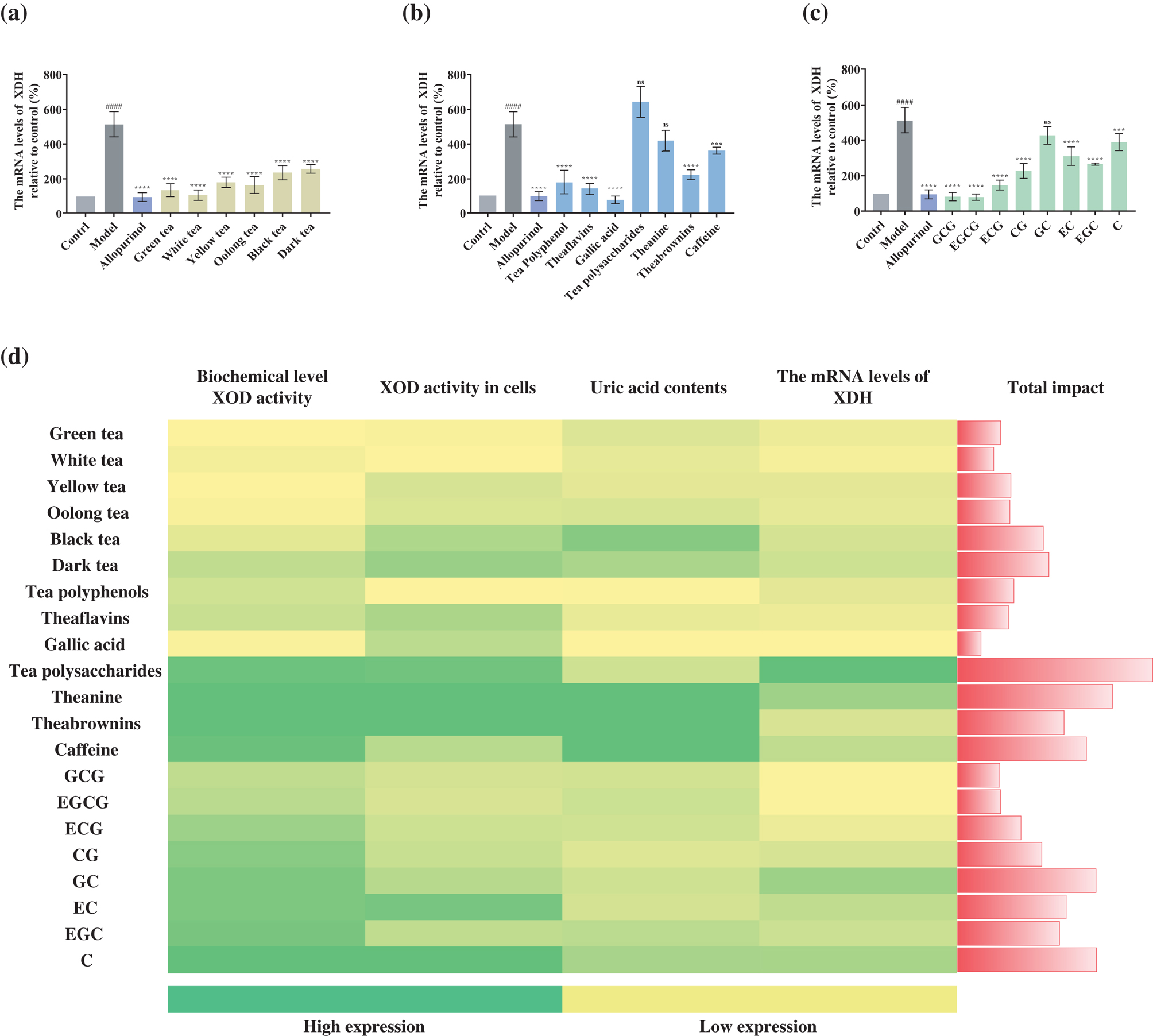 Fig. 8. The expression level of XDH in the sample-treated hyperuric acid cells. (a) The mRNA expression level in cells after the interference of six major teas. (b) The mRNA expression level of XDH in cells after the interference by tea polyphenols, theaflavins, gallic acid, tea polysaccharides theanine, theabrownins, and caffeine. (c) The mRNA expression level of XDH in cells after interference by 8 catechins (GCG, EGCG, ECG, CG, GC, EC, EGC, and C). (d) Correlation analysis between samples (six types of tea, tea polyphenols, theaflavins, gallic acid, tea polysaccharides and theanine, and 8 catechin monomers) and the corresponding biochemical XOD activity, cellular uric acid content, cellular XOD activity, and mRNA expression level of XDH after interference. The yellower the color, the better the effect of inhibiting the production of uric acid; on the contrary, the greener the color, the worse the effect of inhibiting the production of uric acid. The bar graph on the far right represents the total effect of the samples in lowering uric acid. The shorter the rectangle, the stronger the lowering effect of the sample. Positive drug: allopurinol. The data are expressed as mean ± SD. ####P < 0.0001 was compared with the model; nsP > 0.1, *P < 0.1, **P < 0.01, ***P < 0.001, and ****P < 0.0001 were compared with the control.