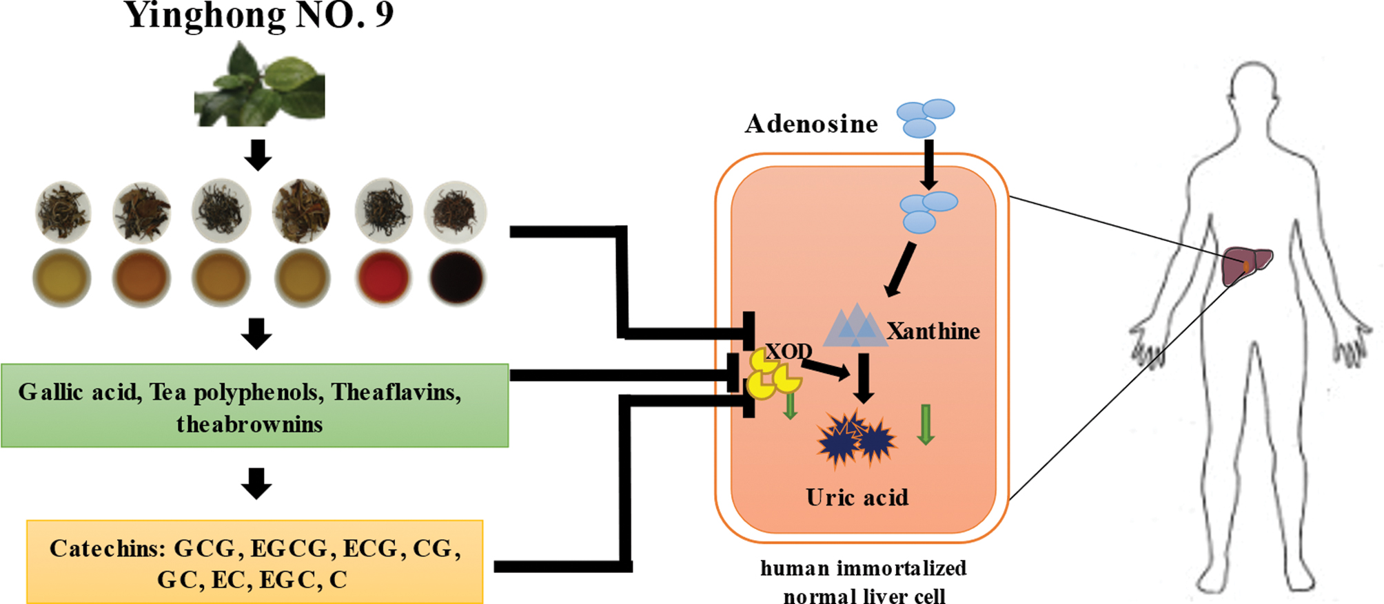 Seventeen samples of the Yinghong No. 9 tea cultivar (six types of tea, black tea fermented for 0, 2, 5, and 8 h, and dark tea stacked for 0, 10, 20, 30, 40, 50, and 60 days) were obtained from the Tea Research Institute of Guangdong Academy of Agricultural Sciences, China. Tea components including C ((+)-Catechin, B21722, high performance liquid chromatography (HPLC) purity ≥ 98%), GC ((-)-Gallocatechin, B20849, HPLC ≥ 98%), EC (Epicatechin, B20102, HPLC ≥ 98%), EGC ((-)-Epigallocatechin, B20105, HPLC ≥ 98%), CG (Catechin gallate, B20350, HPLC ≥ 98%), ECG ((-)-Epicatechin gallate, B20103, HPLC ≥ 98%), GCG ((-)-Gallocatechin gallate, B20850, HPLC ≥ 98%), EGCG (Epigallocatechin gallate, B20106, HPLC ≥ 98%), and gallic acid (B20851, HPLC ≥ 98%) were purchased from Yuanye Biological technology (Shanghai, China). Tea polyphenols (HPLC > 98%), tea polysaccharides (HPLC ≥ 80%), and theaflavins (HPLC ≥ 90%) were extracted from Tea Research Institute of Guangdong Academy of Agricultural Sciences, China. L-L-theanine (C7H14N203, 3081-61-6, HPLC ≥ 98%) was purchased from USP Reference Standard (USA), and theabrownins (2020TB0717, HPLC > 90%) was purchased from Hangzhou Qinyuan Natural Plant High-Tech Co. Ltd (Hangzhou, Zhejiang, China). All reagents were stored at 2–8°C. Peroxidase (POD) (S10062, HPLC ≥ 98%), allopurinol (B27249, HPLC ≥ 98%), 2,6-dihydroxypurine (B20561, HPLC ≥ 98%), 4-aminoantipyrine (B34212, HPLC ≥ 98%), XOD (S10113, HPLC ≥ 98%), and (-)-epicatechin gallate (Cat#B20103, HPLC ≥ 98%) were purchased from Yuanye Biological Technology (Shanghai, China) and stored at −20°C. XOD (X1875, Sigma, USA) and caffeine (P/N: 71559, HPLC = 99.8%, TMstandard, Beijing, China) were also stored at −20°C. Ethyl acetate (w/% ≥ 99.5%), 95% ethanol (w/% ≥ 95%), n-butanol (w/% ≥ 99.5%) were purchased from Tianjin Yongda Chemical Reagent Co., Ltd and stored at room temperature.