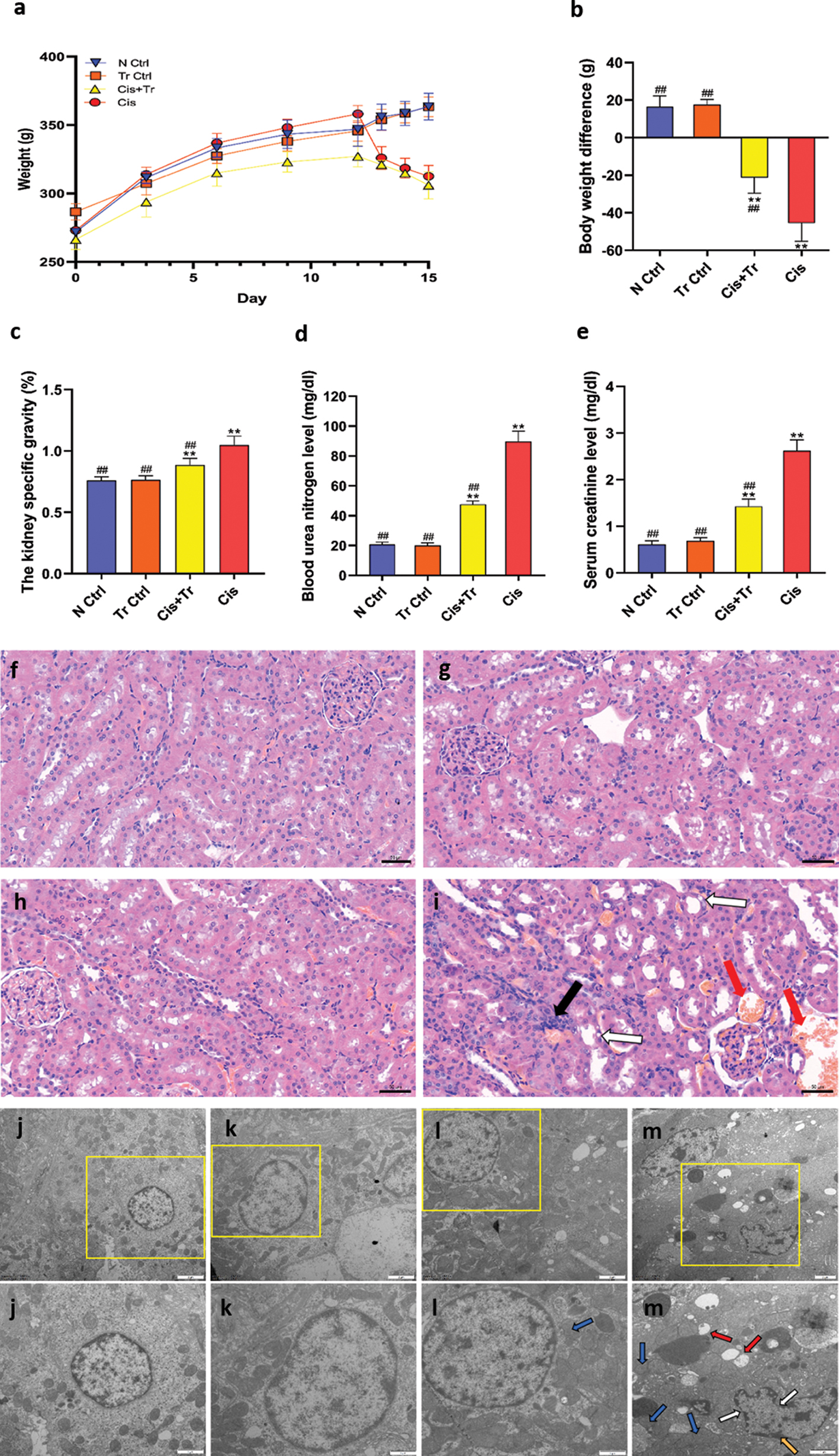 Fig. 1. Troxerutin alleviated weight loss and renal dysfunction in rats. (a) Changes in body weight of rats. (b) Body weight difference. (c) The kidney specific gravity. (d) Blood urea nitrogen level. (e) Serum creatinine level. N Ctrl, normal control group; Tr Ctrl, troxerutin control group; Cis+Tr, cisplatin and troxerutin-treated group; Cis, cisplatin-treated group. Each bar represents the M ± SD of 10 animals. Statistical analysis by one-way ANOVA followed by Tukey-Kramer multiple comparisons. **P < 0.01 denotes comparison with the N Ctrl group. ##P < 0.01 denotes comparison with the Cis group. (f–i) H&E staining for the normal control group, troxerutin control group, cisplatin and troxerutin-treated group, and cisplatin-treated group, respectively. Scale bar = 50 μm. Black arrow, inflammatory cells infiltration; White arrow, vacuolar degeneration; Red arrow, erythrocytosis. (j–m) Transmission electron microscopy for ultrastructure assessment of kidney in the normal control group, troxerutin control group, cisplatin and troxerutin-treated group, and cisplatin-treated group, respectively. Scale bar = 2 μm. (j–m) Detail magnification from j–m. Scale bar = 1 μm. White arrow, the nuclear shrinkage; Red arrow, vacuolation; Yellow arrow, the chromatin edge aggregation; Blue arrow, mitochondrial cristae fracture.