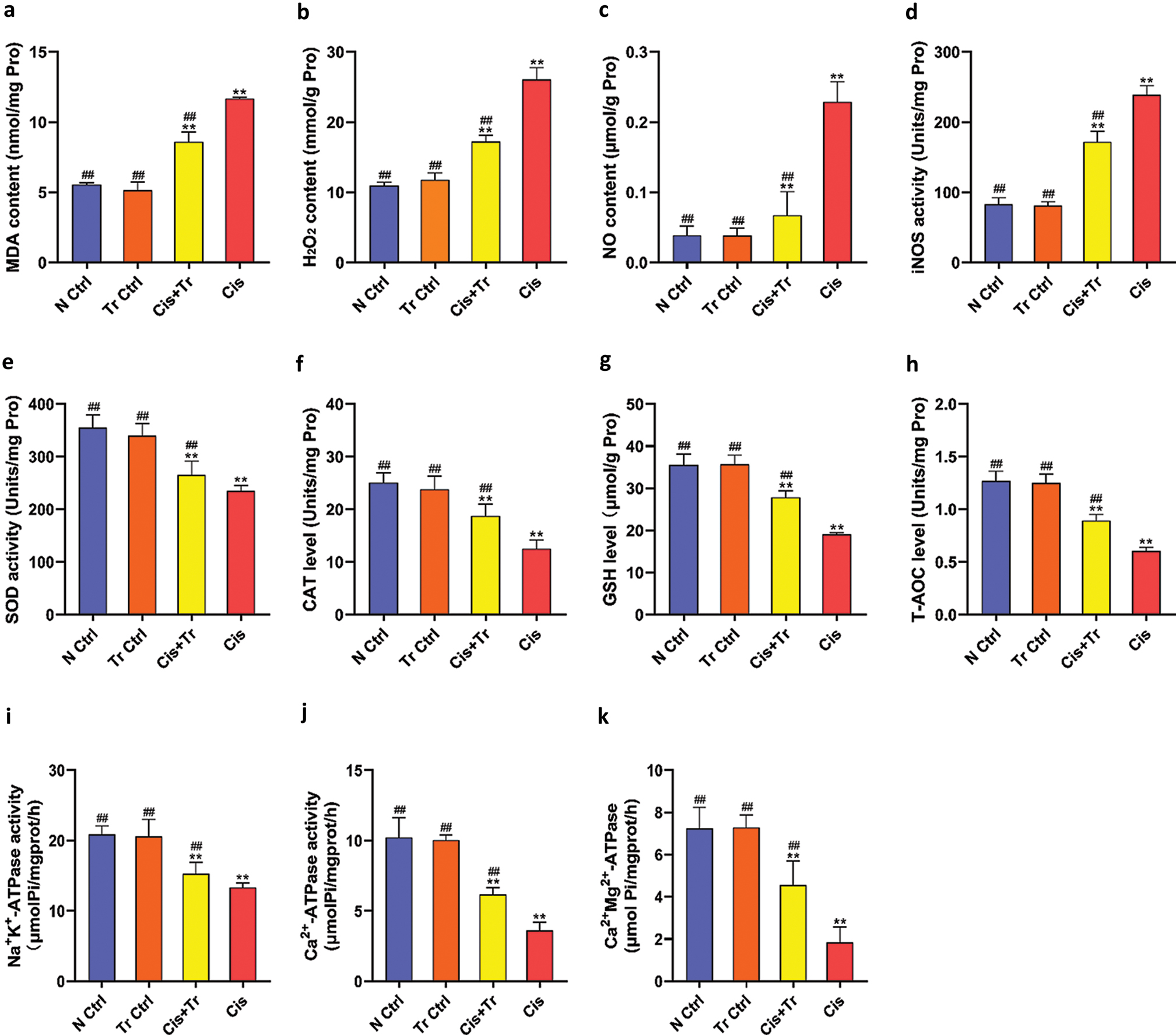 The activities of Na+K+-ATPase,Ca2+-ATPase, and Ca2+Mg2+-ATPase were measured and are shown in Fig. 2i–k. All data showed no significant difference between the N Ctrl group and the Tr Ctrl group (P > 0.05). ATPase activities in the Cis group were significantly decreased compared to the N Ctrl group (P < 0.01), while the Cis+Tr group had an increased effect on ATPase activities compared to the Cis group (P < 0.01).