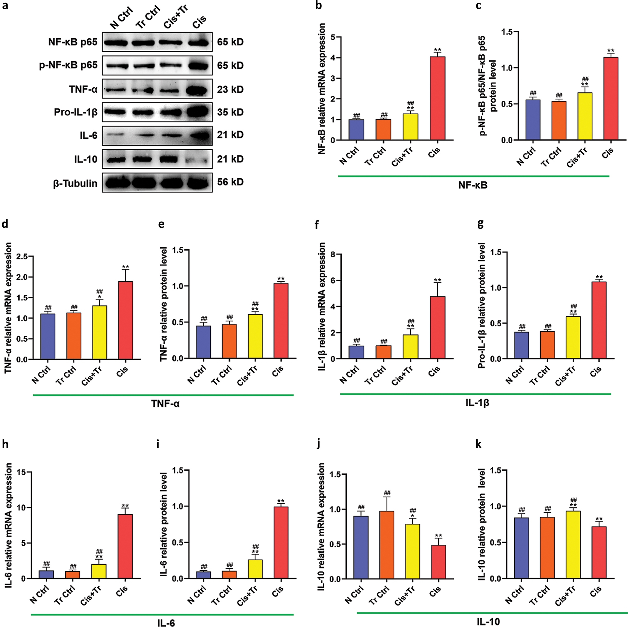 Fig. 3. Troxerutin alleviated renal inflammation. (a) Western blotting of NF-κB p65, p-NF-κB p65, TNF-α, Pro-IL-1β, IL-6, and IL-10. (b) NF-κB relative mRNA expression. (c) p-NF-κB p65/NF-κB p65 protein level. (d) TNF-α relative mRNA expression. (e) TNF-α relative protein level. (f) IL-1β relative mRNA expression. (g) Pro-IL-1β relative protein level. (h) IL-6 relative mRNA expression. (i) IL-6 relative protein level. (j) IL-10 relative mRNA expression. (k) IL-10 relative protein level. N Ctrl, normal control group; Tr Ctrl, troxerutin control group; Cis+Tr, cisplatin and troxerutin-treated group; Cis, cisplatin-treated group. Each bar represents the M ± SD of 10 animals. Statistical analysis by one-way ANOVA followed by Tukey-Kramer multiple comparisons. *P < 0.05 and **P < 0.01 denote comparison with the N Ctrl group. ##P < 0.01 denotes comparison with the Cis group.