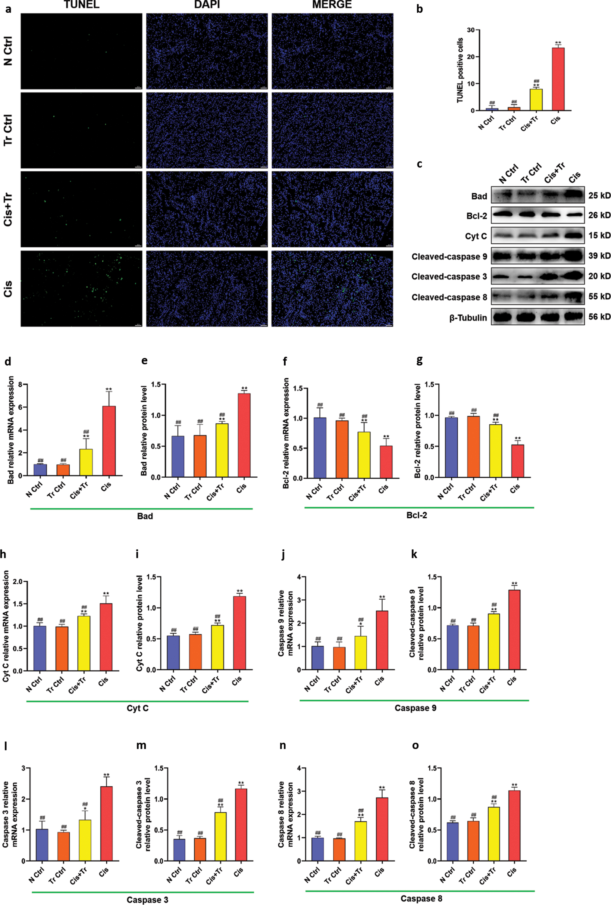 Fig. 4. Troxerutin alleviated renal cell apoptosis. (a) TUNEL assay of renal cell apoptosis. Scale bar = 50 μm. (b) TUNEL positive cells. (c) Western blotting of Bad, Bcl-2, Cyt C, Cleaved-caspase 9, Cleaved-caspase 3, and Cleaved-caspase 8. (d) Bad relative mRNA expression. (e) Bad relative protein level. (f) Bcl-2 relative mRNA expression. (g) Bcl-2 relative protein level. (h) Cyt C relative mRNA expression. (i) Cyt C relative protein level. (j) Caspase 9 relative mRNA expression. (k) Cleaved-caspase 9 relative protein level. (l) Caspase 3 relative mRNA expression. (m) Cleaved-caspase 3 relative protein level. (n) Caspase 8 relative mRNA expression. (o) Cleaved-caspase 8 relative protein level. N Ctrl, normal control group; Tr Ctrl, troxerutin control group; Cis+Tr, cisplatin and troxerutin-treated group; Cis, cisplatin-treated group. Each bar represents the M ± SD of 10 animals. Statistical analysis by one-way ANOVA followed by Tukey-Kramer multiple comparisons. *P < 0.05 and **P < 0.01 denote comparison with the N Ctrl group. ##P < 0.01 denotes comparison with the Cis group.