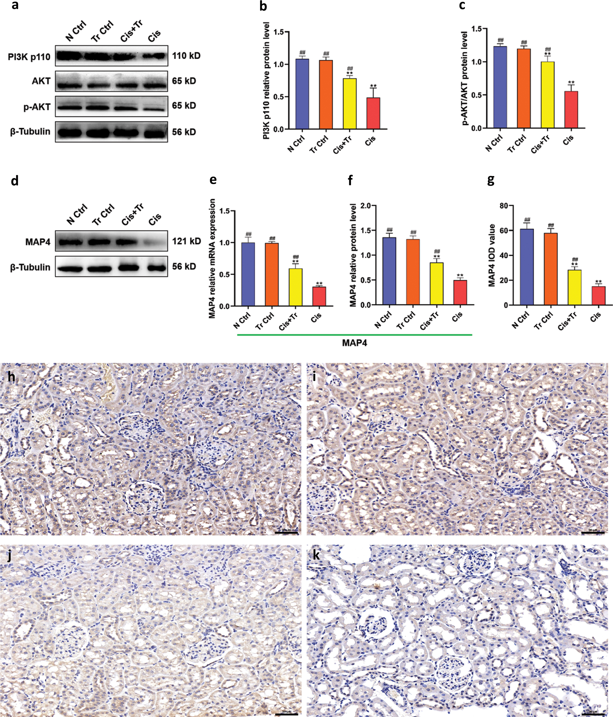 Fig. 5. Troxerutin regulated PI3K/AKT pathway via enhancing MAP4 expression. (a) Western blotting of PI3K p110, AKT, and p-AKT. (b) PI3K p110 relative protein level. (c) p-AKT/AKT protein level. (d) Western blotting of MAP4. (e) MAP4 relative mRNA expression. (f) MAP4 relative protein level. (g) MAP4 IOD value. (h–k) Immunohistochemistry analysis showing the distribution and abundance of MAP4 in the normal control group, troxerutin control group, cisplatin and troxerutin-treated group, and cisplatin-treated group, respectively. Scale bar = 50 μm. N Ctrl, normal control group; Tr Ctrl, troxerutin control group; Cis+Tr, cisplatin and troxerutin-treated group; Cis, cisplatin-treated group. Each bar represents the M ± SD of 10 animals. Statistical analysis by one-way ANOVA followed by Tukey-Kramer multiple comparisons. **P < 0.01 denotes comparison with the N Ctrl group. ##P < 0.01 denotes comparison with the Cis group.