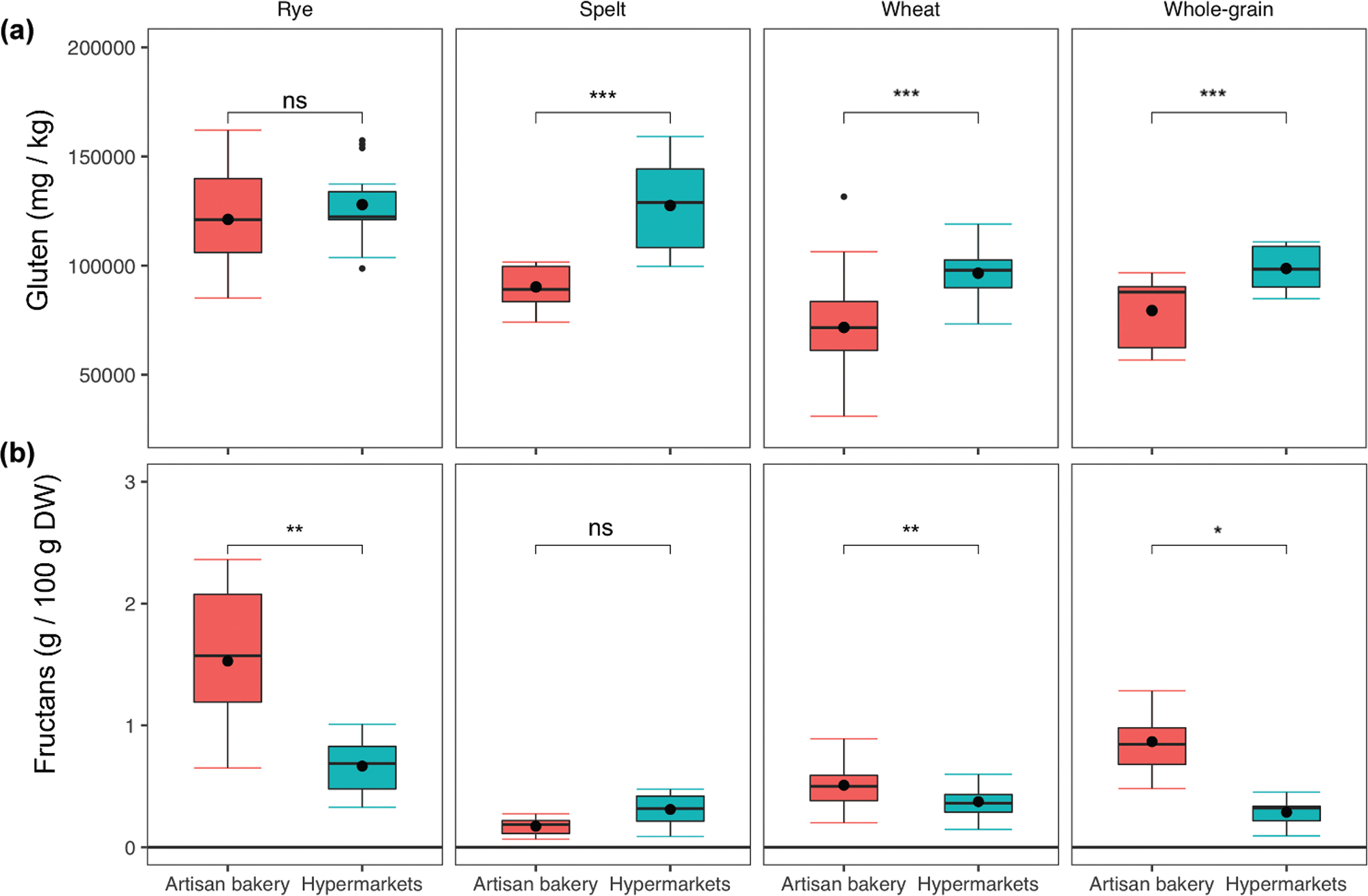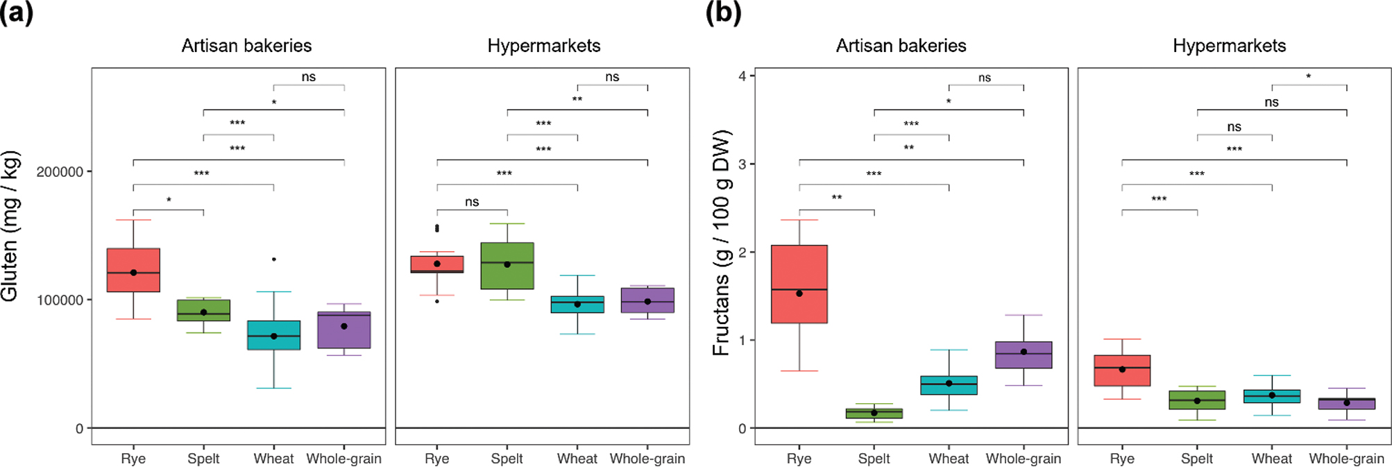 Fig. 1. (a) Gluten (mg/kg) and (b) fructan (g/100 g DW) contents in rye, spelt, whole grain, and wheat-based breads from artisan bakeries and hypermarkets. *, P < 0.05; **, P < 0.01; ***, P < 0.001; ns, no significant; DW, dry weight. The black dot indicates the mean. Statistical significances were calculated by t-test and Mann–Whitney test for parametric and non-parametric data, respectively.