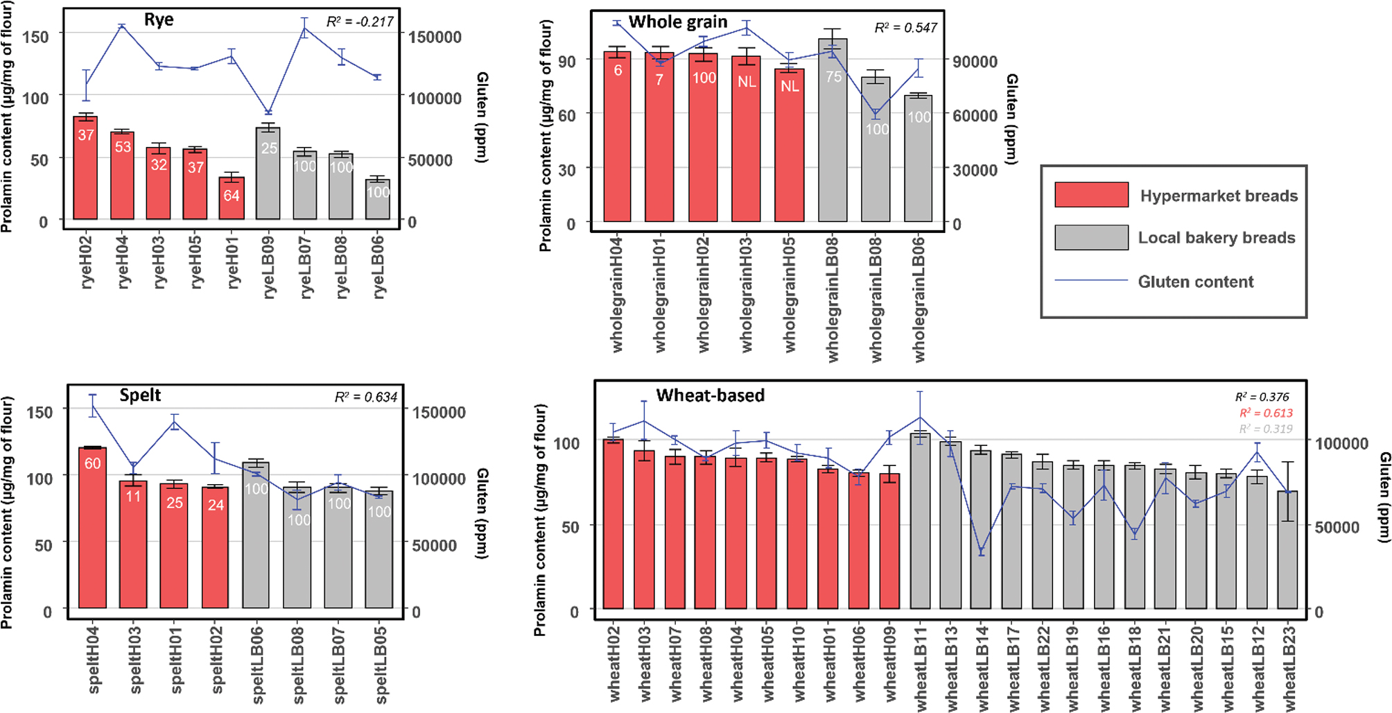 Fig. 3. Correlation between the prolamin and gluten by the R5 moAb content of rye, spelt, whole grain, and wheat-based breads from artisan bakeries and hypermarkets. Bars indicate the standard deviation for replicates. R2 for each type of bread was calculated by the Pearson correlation test. R2 was also calculated for wheat-based bread from artisan bakeries (grey) and hypermarkets (red) separately.