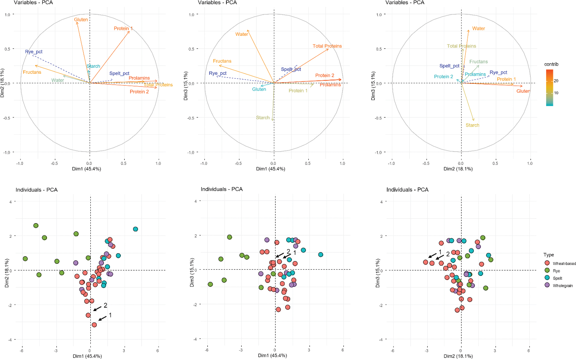 Fig. 4. Principal components analysis (PCA). 1) First and second dimensions, 2) first and third dimensions, and 3) second and third dimensions plots of the (up) variables in a color gradient according to the contribution to the variability and supplementary variables in blue and (down) individual breads colored according the generic type they are sold. Variables Protein 1 and ppm contribute almost only to second dimension. Breads pointed with arrows, the lowest immunotoxic ones, are made of (1) 100% durum wheat and of (2) 40% tritordeum. Pct, percentage; Dim, dimension; contrib, contribution.