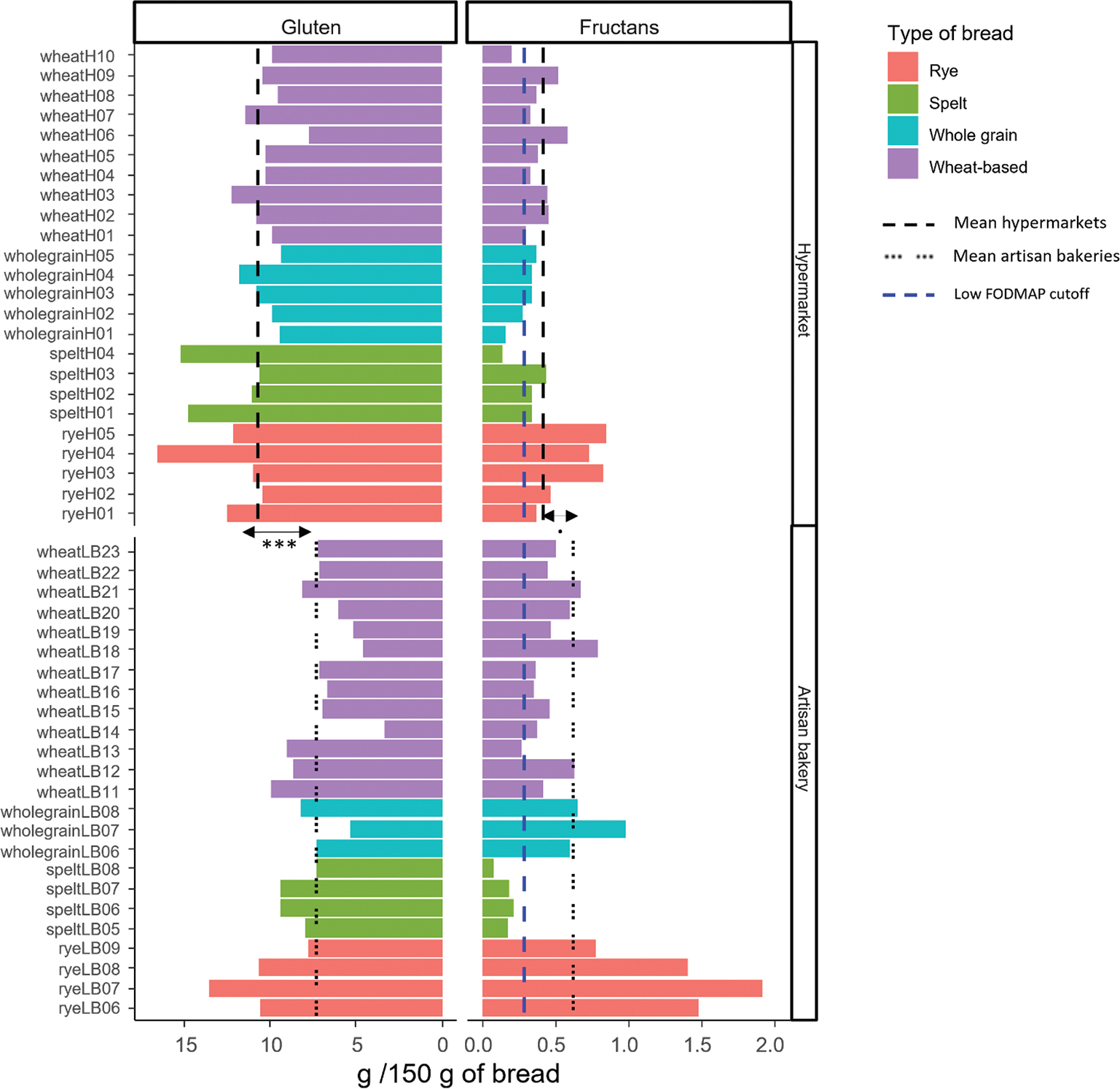 Results: Great variation for the content of gluten and fructans has been found between all bread categories. Although breads produced using long fermentation (artisan bakeries) contain significantly lower gluten, they have higher fructans than those using short fermentations (hypermarkets). Durum wheat breads had the lowest content of gluten. Moreover, spelt breads from artisan bakeries had the lowest content of fructans but not those from hypermarkets.
