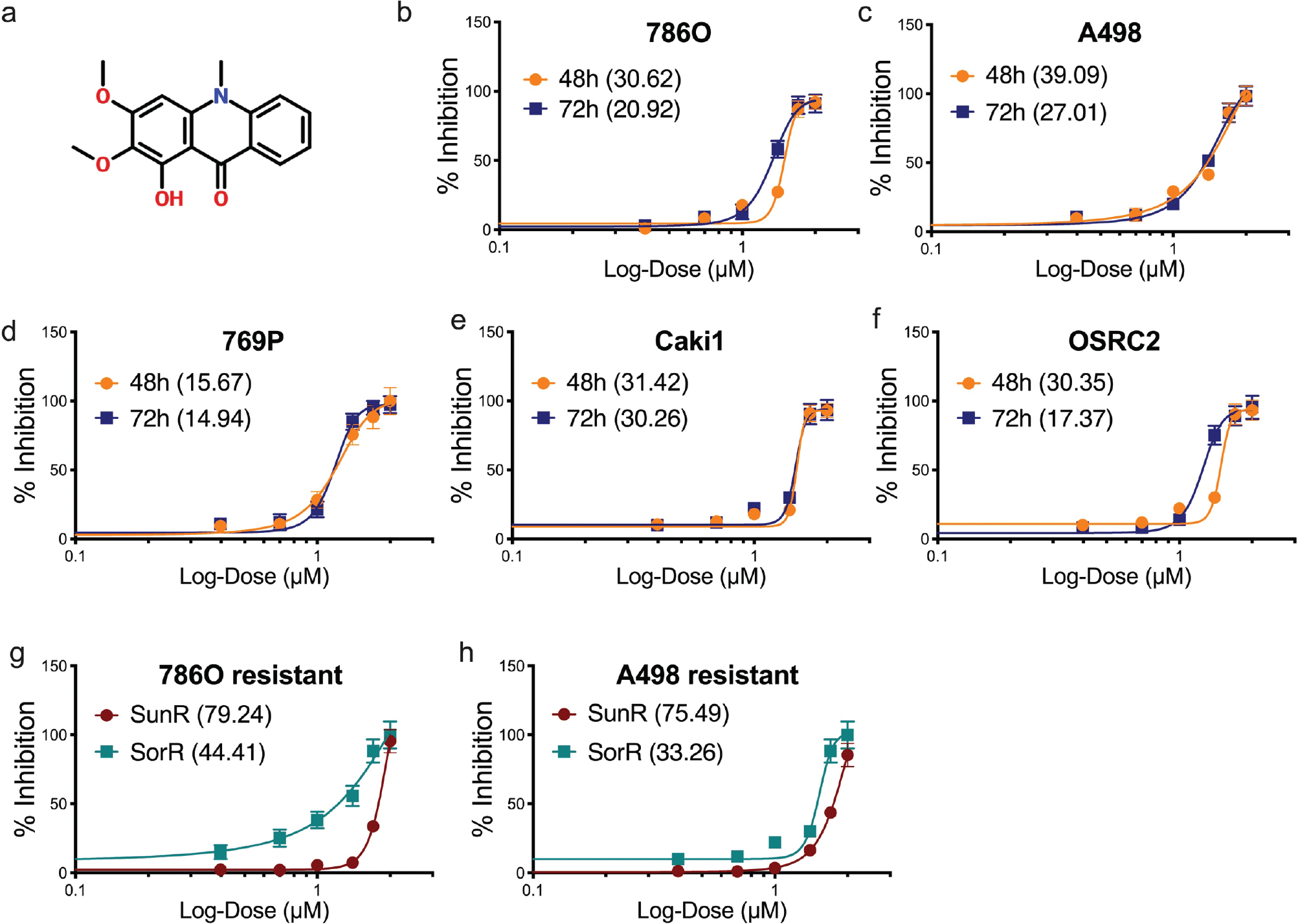Fig. 1. Arborinine shows inhibitory effect in clear-cell renal cell carcinoma (ccRCC) cells. (a) The chemical structure of Arborinine. (b–h) IC50s of Arborinine against viability of different ccRCC cell lines with IC50 doses in µM in parenthesis. SunR: Sunitinib-resistant; SorR: Sorafenib-resistant.