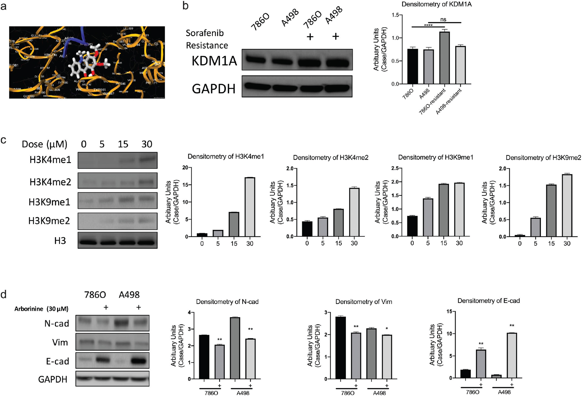 Arborinine was reported to inhibit KDM1A activity in other cancers. We first performed in silico analysis showing Arborinine conjugating KDM1A protein with high prediction score (Fig. 2a). To choose appropriate cell lines for modeling, we found that 786O and A498 cells showed constitutive KDM1A levels (Fig. 2b). Interestingly, Sorafenib-resistant 786O cells showed increased KDM1A level as compared to treatment-naïve cells (Fig. 2b). We then tested histone H3K4me1/2 and H3K9me1/2 in 786O cells treated with gradient doses of Arborinine and showed gradual increase in histone proteins (Fig. 2c). KDM1A has been showed to mediate EMT, and we showed that pro-EMT molecules were significantly decreased following Arborinine in two ccRCC cell lines (Fig. 2d).
