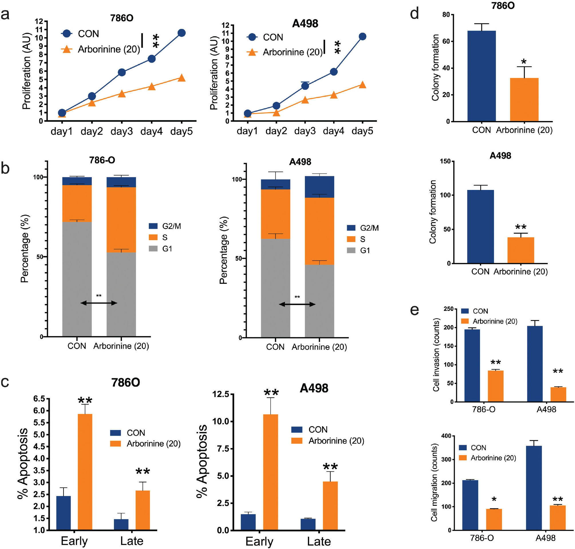 Fig. 3. Arborinine inhibits cell fitness of clear-cell renal cell carcinoma (ccRCC). Arborinine at a fixed dose of 20 µM impacting on (a) cell proliferation detected by MTT assay, (b) cell cycle population, (c) apoptosis detected by flow cytometry, (d) anchorage-independent colony formation detected by agar assay, and (e) cell migration and invasion detected by Transwell assays. All treatments are at a dose of 20 µM (*P < 0.05; **P < 0.01).