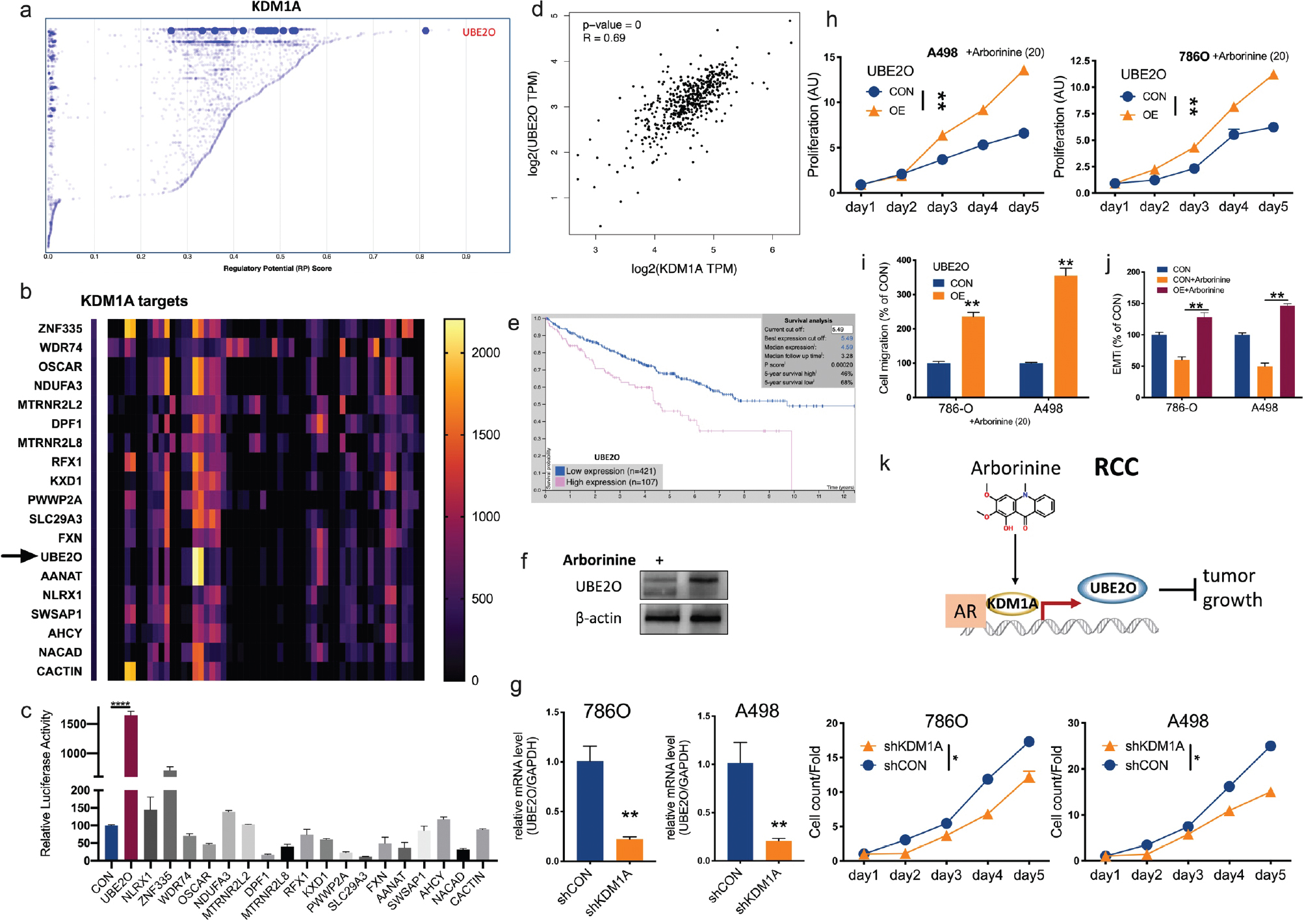 Fig. 4. Arborinine inhibits KDM1A/UBE2O axis in ccRCC. (a) Reproduced from CistromeDB, shown was transcriptional score of target genes by KDM1A; (b) reproduced from ChIP-Atlas, shown was top 20 transcriptional targets of KDM1A; (c) luciferase activity of candidate target genes in 786O cells in response to KDM1A overexpression; reproduced from TCGA dataset, shown were (d) correlation between expressions of KDM1A and UBE2O and (e) overall survival between cases with higher or lower UBE2O expression; (f) protein level of UBE2O in 786O cells treated with Arborinine; (g) UBE2O mRNA expression in ccRCC cells with silencing of KDM1A and proliferation; replenish of UBE2O by overexpression (OE) in ccRCC cells treated with Arborinine at 20 µM, shown were differences in (h) proliferation, (i) migration, and (j) EMTi profiled by luciferase activity of VIM/CDH1; (k) schematic cartoon of regulatory signaling of Arborinine in ccRCC (*P < 0.05; **P < 0.01).